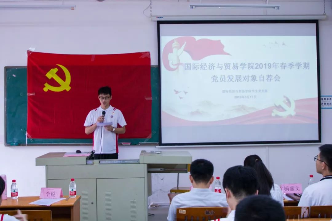 为深入贯彻党的十九大精神,做好党支部党员发展工作,为党注入新鲜血液。2019年5月17日下午16:00,国际经济与贸易学院学生党支部在博学楼C405召开2019年春季学期党员发展对象自荐会。