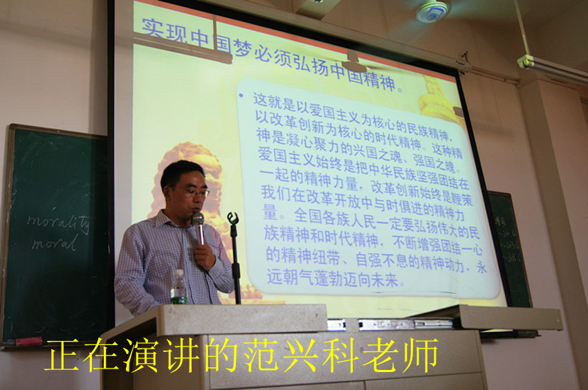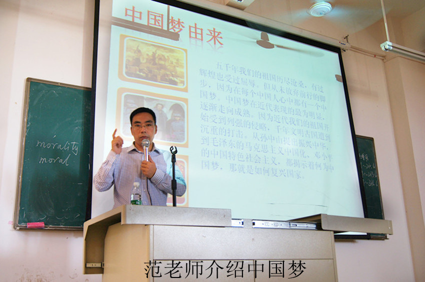 开始,范老师用天下梦、国家梦、个人梦三个层面解读“梦”,并引用数个名家对中国梦的精辟见解去说明梦想决定国的强弱、家的兴衰以及人的优劣。“中国梦”的视频,揭示何为中国梦,让同学们明白追梦与圆梦的过程充满荆棘与挑战。他还阐述了实现中国梦必须坚定信念、走中国道路、锁定中国目标、凝聚中国力量和落实强国战略,从而复兴强国梦。