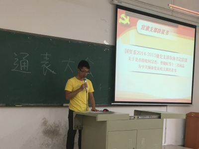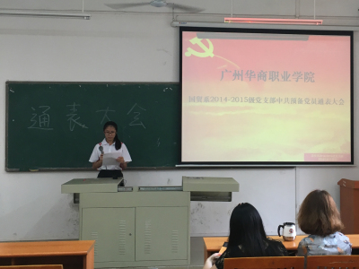 2016年6月12日下午4点,广州华商职业学院国贸系14、15级党支部中共预备党员通表大会在博学楼C207召开,大会就接收何宗杰、曾晓虹等13名发展对象为中共预备党员进行讨论。国贸系14、15级党支部书记余泳、副书记韩双苑、支部部分成员以及15级入党积极分子出席本次大会。