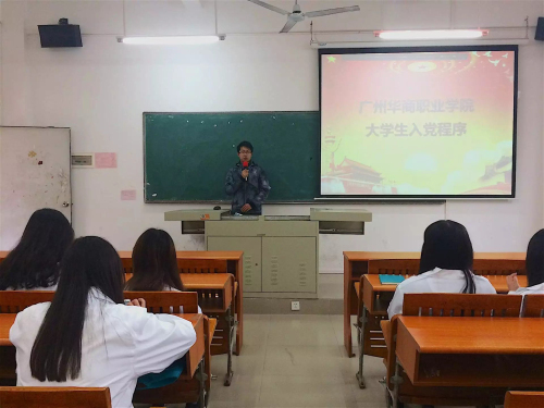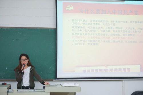 授课伊始,主讲人让学员们思考为什么要加入中国共产党,并且联系自身入党经历,结合日常学习生活,要求学员们提高思想觉悟,端正入党动机;接着,详细地为学员们介绍了大学生入党流程及本系党总支的组织架构;最后,组织学员们观看《永远在路上》第二集《以上率下》。