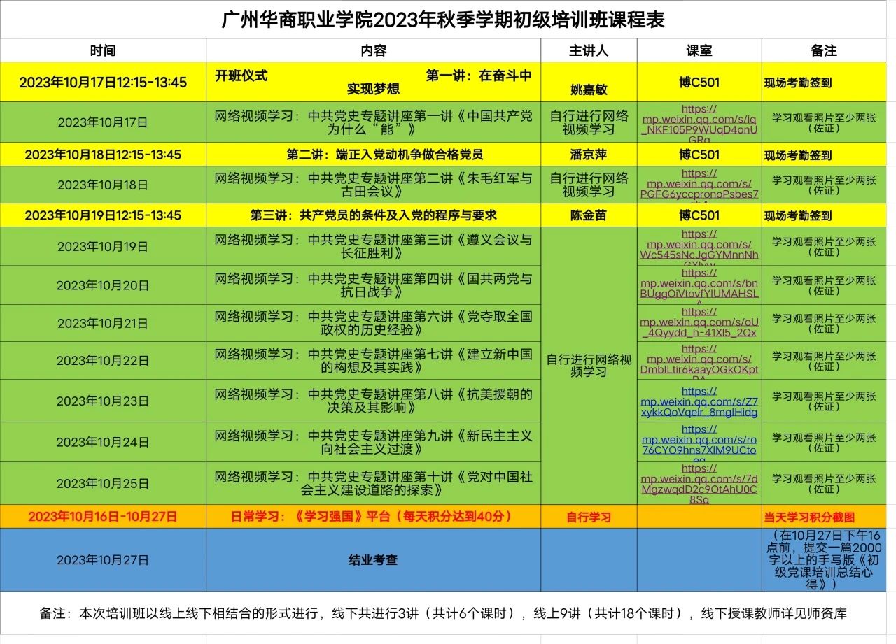 本次党课培训形式分为两部分:线上网络视频培训及线下授课,具体课程名称、上课时间见下图。