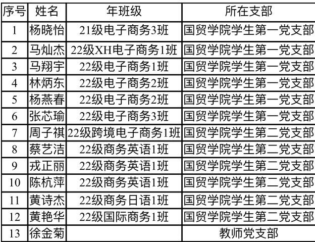 为增强发展党员工作的透明度,接受党内外群众监督,确保发展党员的质量,根据《中国共产党章程》和《中国共产党发展党员工作细则》的相关规定,经党总支培养教育和考察,拟接收第29期发展对象杨晓怡和第30期发展对象马灿杰等13名同志为中共预备党员,现将名单公示如下: