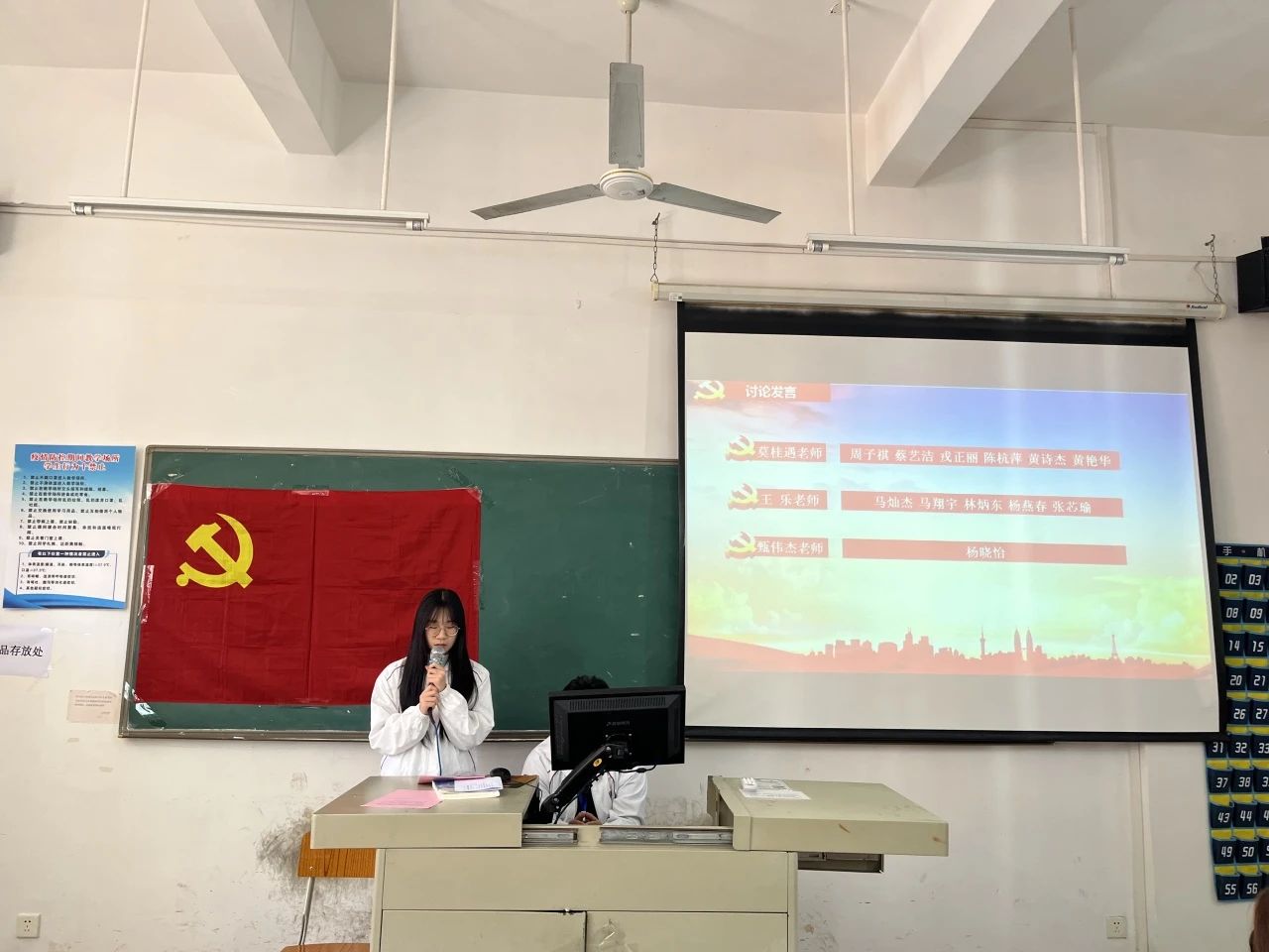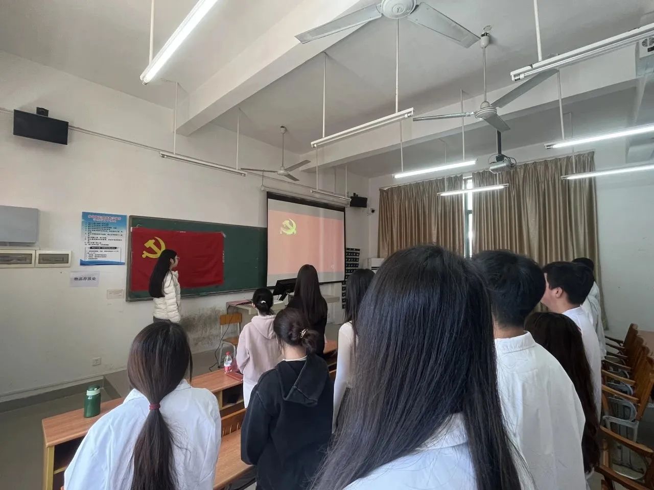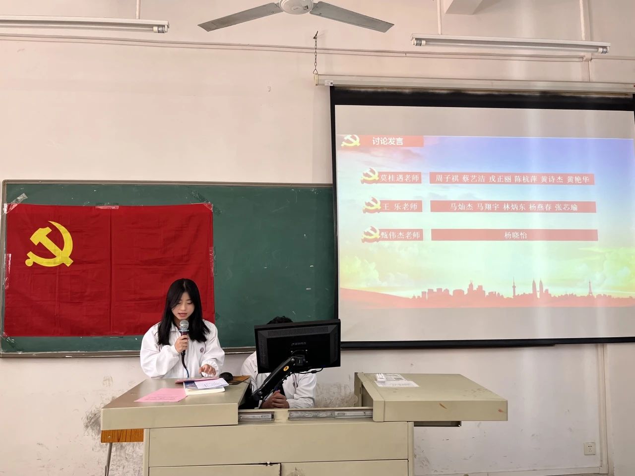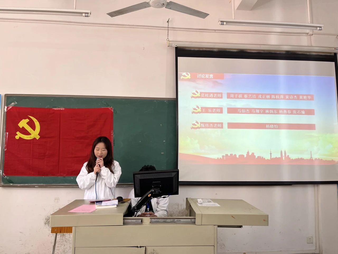学生第一党支部组织委员甄伟杰老师宣布:杨晓怡等6名学生第一党支部发展对象,对党的认识正确,发展动机端正,且6名发展对象本人、家庭、主要社会关系情况填写清楚,与组织掌握情况相符。通过党支部委员会讨论研究,学生第一党支部6名同志符合党员要求,有关材料齐全完备,可以提交党支部大会审议。