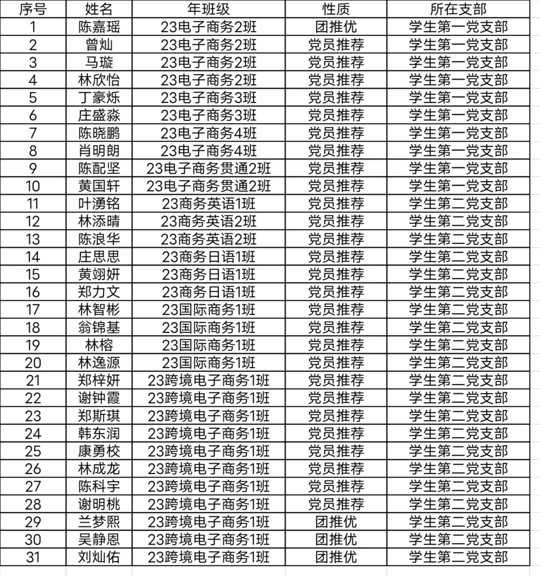 根据我院党总支发展党员工作程序,经基层团组织推优和党员推荐,支部委员会讨论通过,并报上级党委审查备案,拟推荐陈嘉瑶等31位同学为第三十期入党积极分子,现将名单予以公示如下: