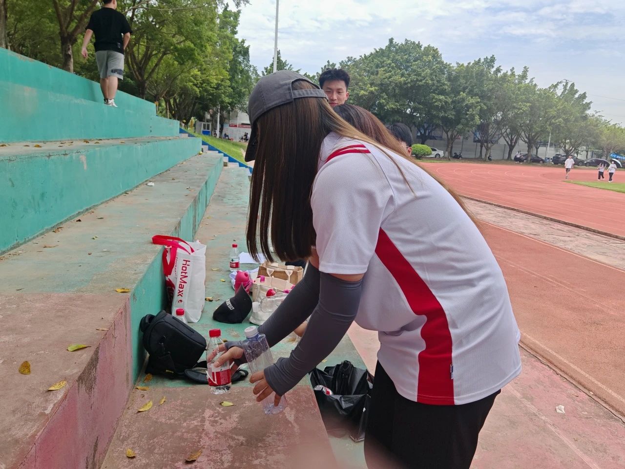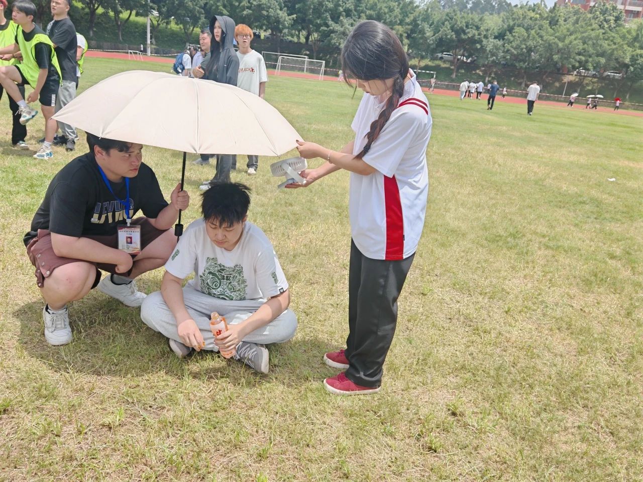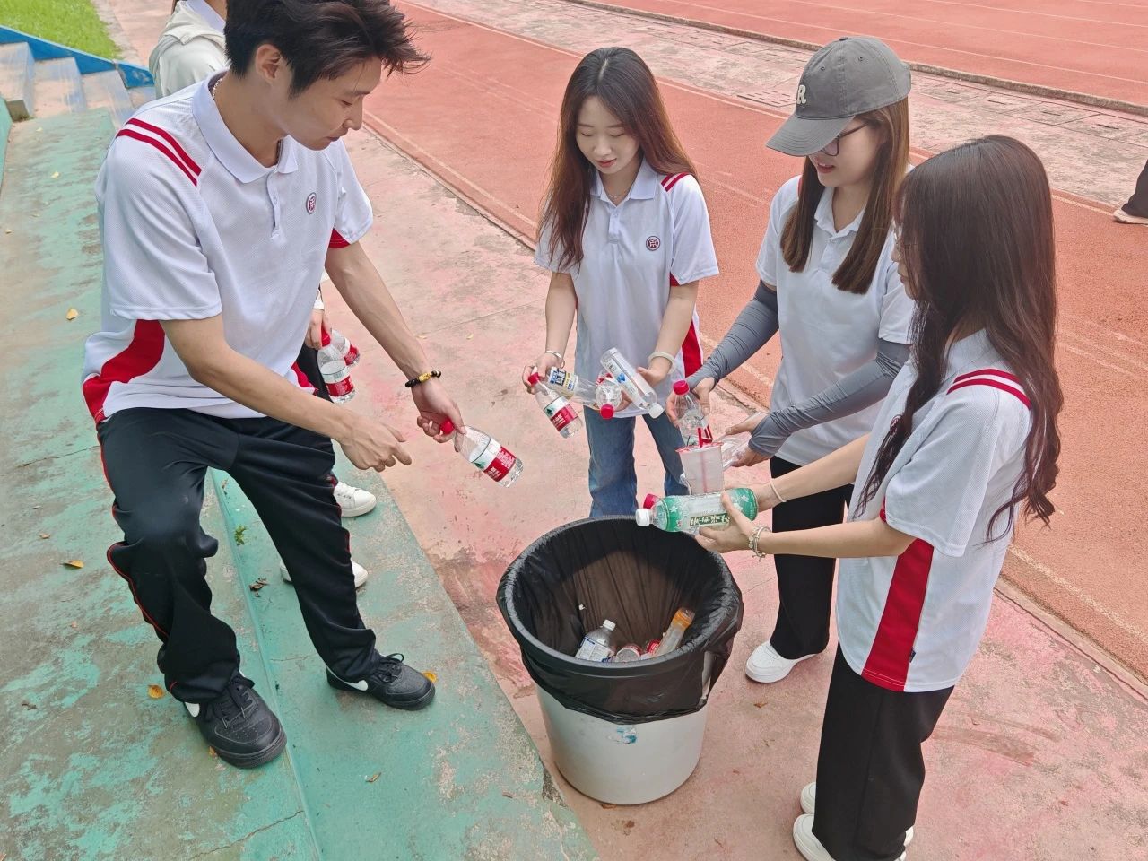 运动会期间,党员志愿者们化身为校园环保工,及时清理运动会现场的饮料瓶、纸巾等垃圾,携手创造一个干净、整洁、舒适的校园环境。