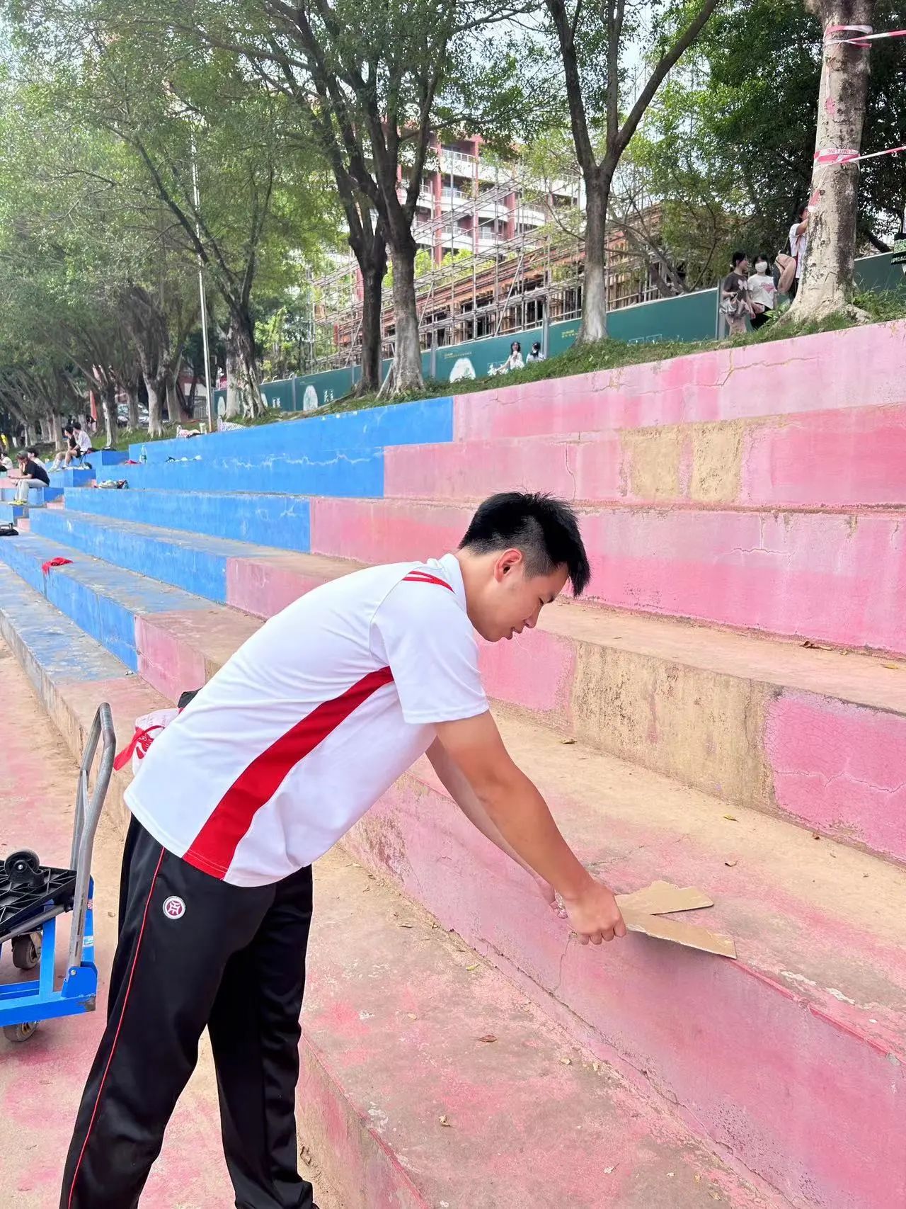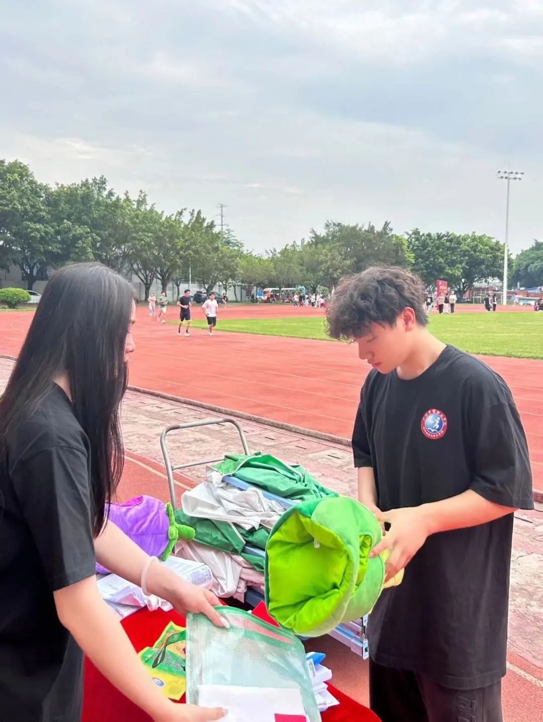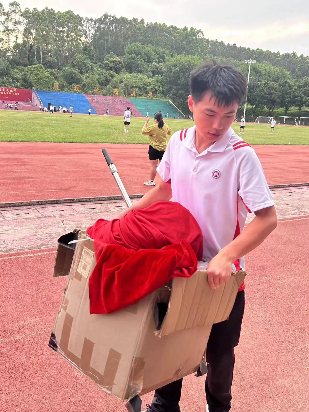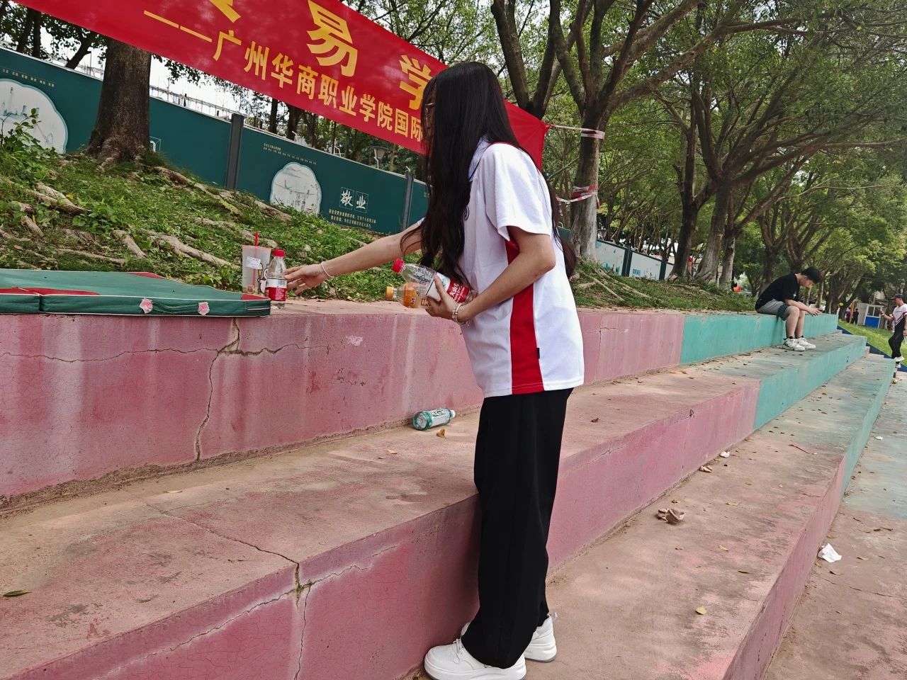 运动会期间,党员志愿者们化身为校园环保工,及时清理运动会现场的饮料瓶、纸巾等垃圾,携手创造一个干净、整洁、舒适的校园环境。