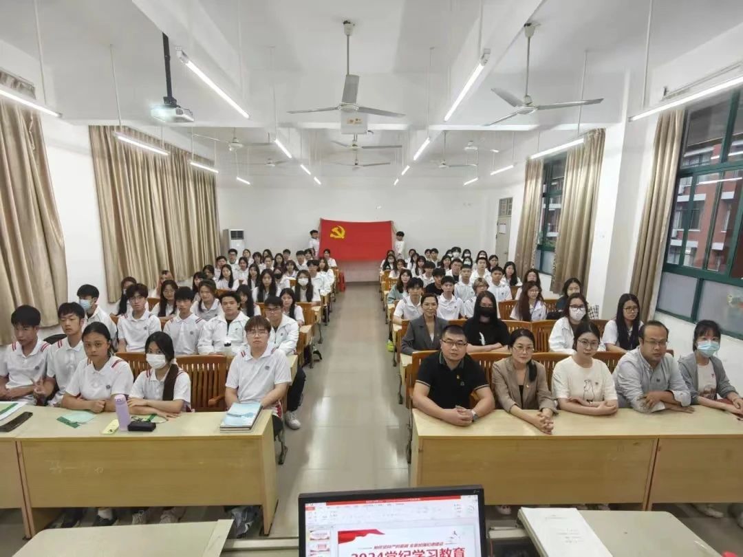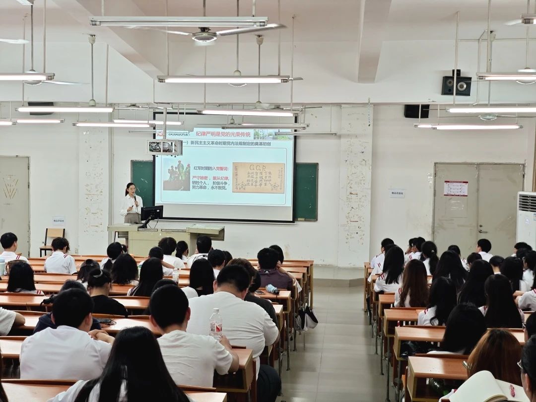 王嘉诚老师以“强化纪律意识,锤炼党性修养”为主题带领同学们了解了习近平总书记关于全面从严治党的重要论述,解释了什么是全面从严治党、为什么要全面从严治党以及全面从严治党的具体内涵;解读了《中国共产党纪律处分条例》修订内容重点,讲解了“党员涉黄涉毒应开除党籍”“网络空间有不当言行将会被处分”“导致餐饮浪费将会被处分”等一共十四条重点内容学习。
