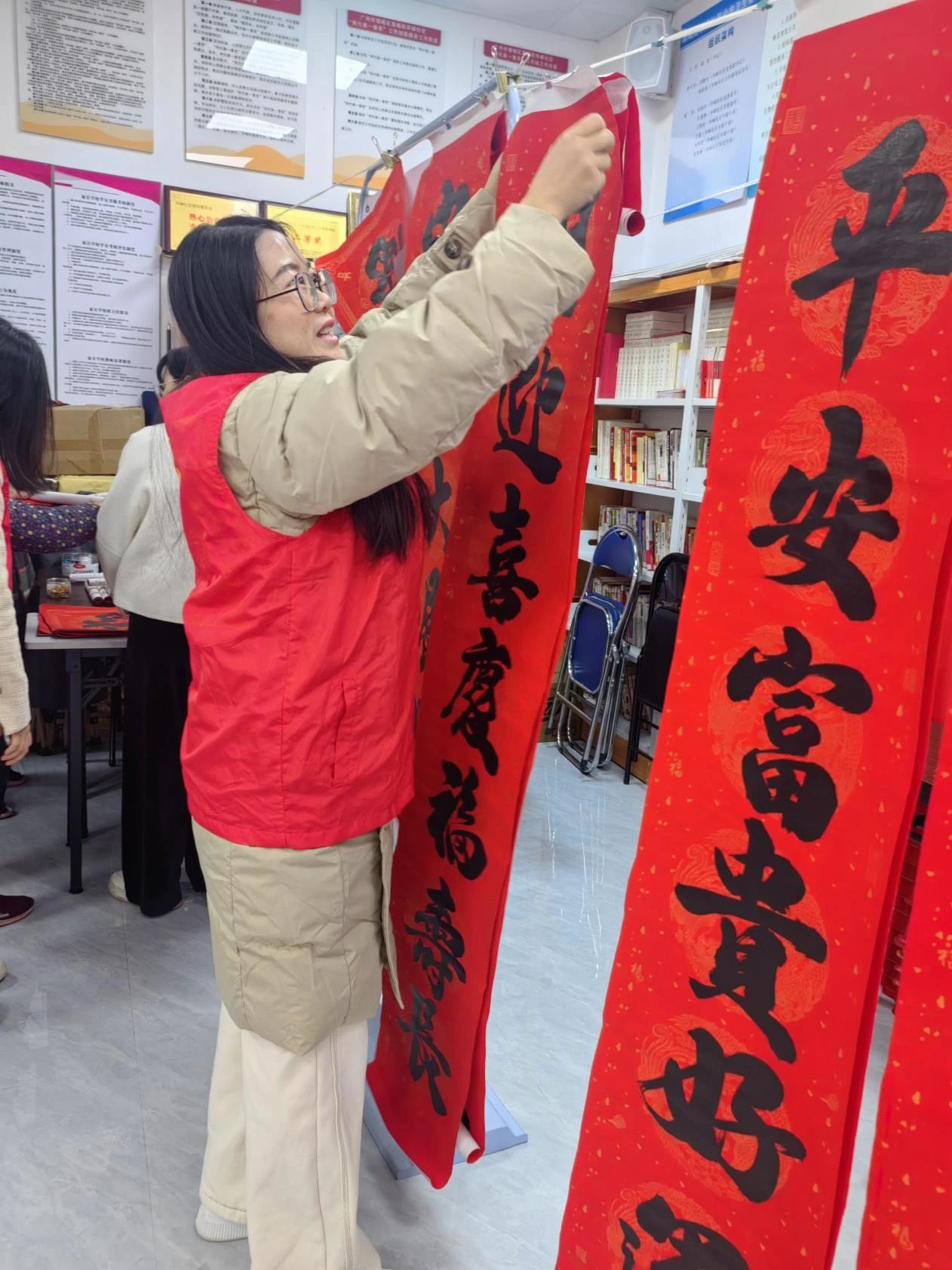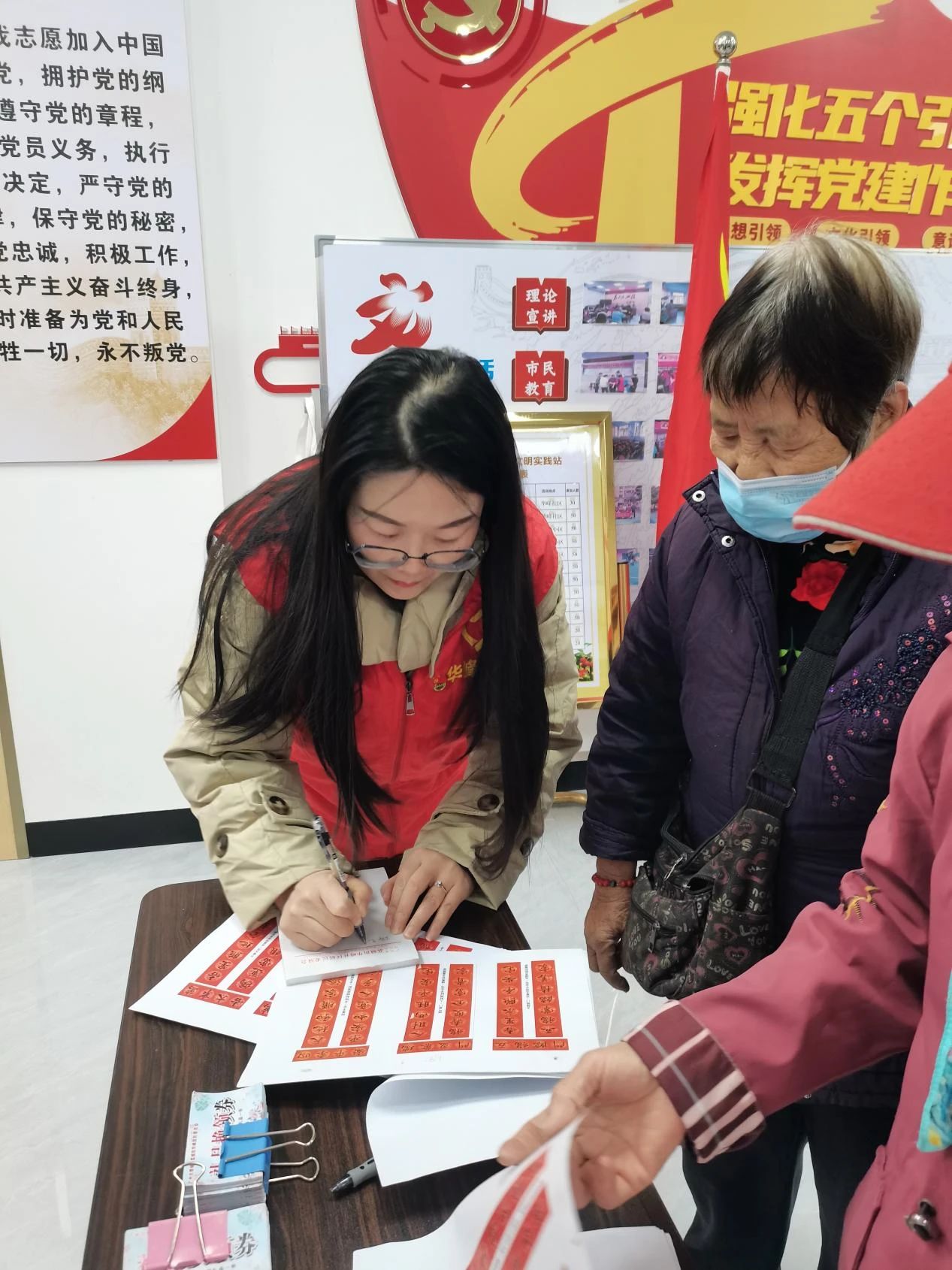 活动现场,党员教师们迅速融入其中,协助书法爱好者们一起在红彤彤的纸上挥毫泼墨。老师们笔锋灵动,墨香四溢,一幅幅寓意吉祥的春联接连诞生。这些作品承载着志愿者对居民们满满的新春祝愿。