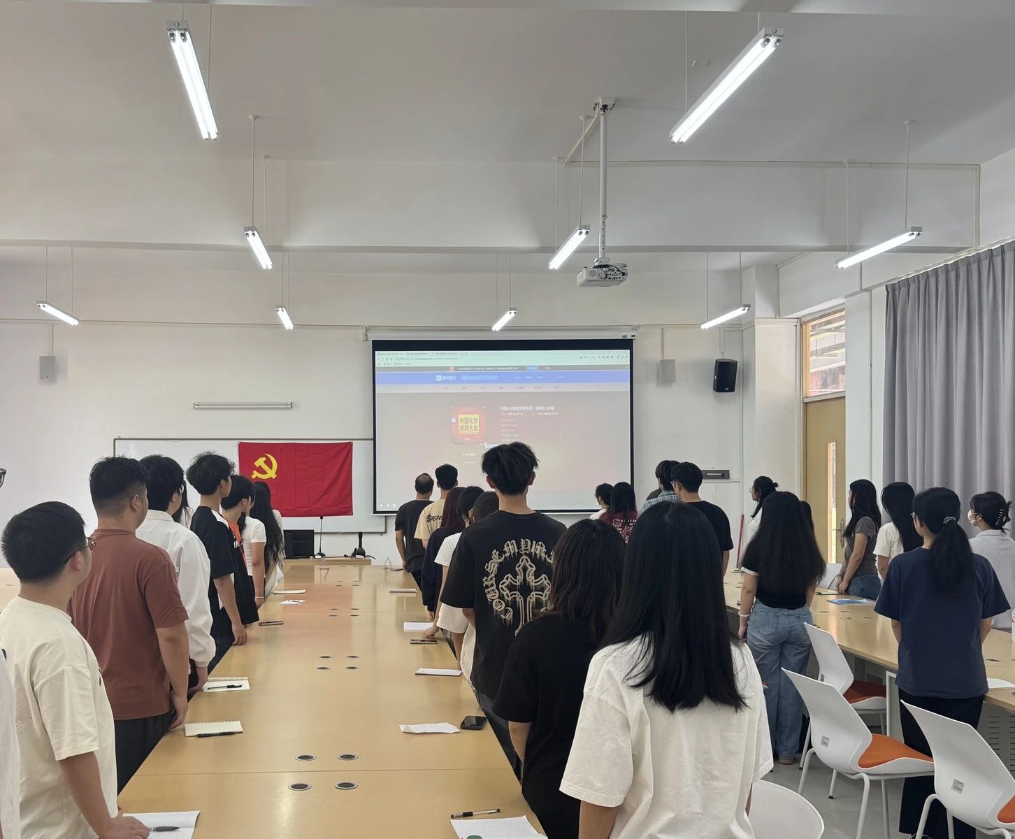 全体成员整齐肃立,面向鲜红党旗,齐声高唱《国际歌》。