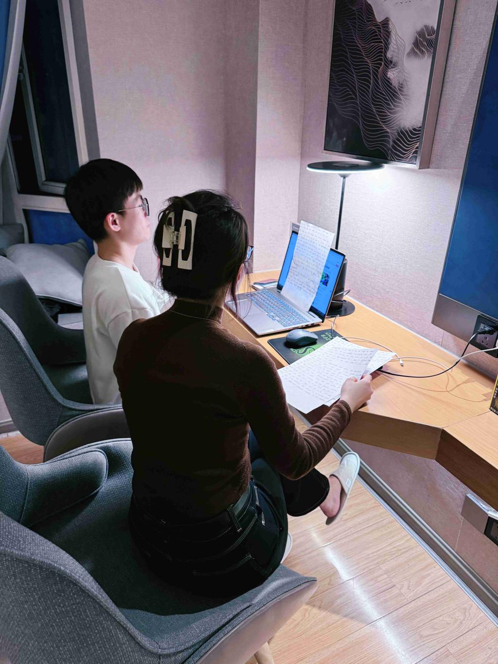为在比赛中取得优异成绩,参赛团队在寒假期间提前返校,进行了紧张的集训备赛,深入研究竞赛内容,反复演练技能操作流程和分析复盘。周碧茵老师、张维锴老师全程跟进,进行答疑辅导,并针对跨境店铺视觉营销设计、英文直播话术打磨以及口语提升等难点,制定个性化训练计划,通过反复演练与复盘,不断提升团队协作能力和专业技能。