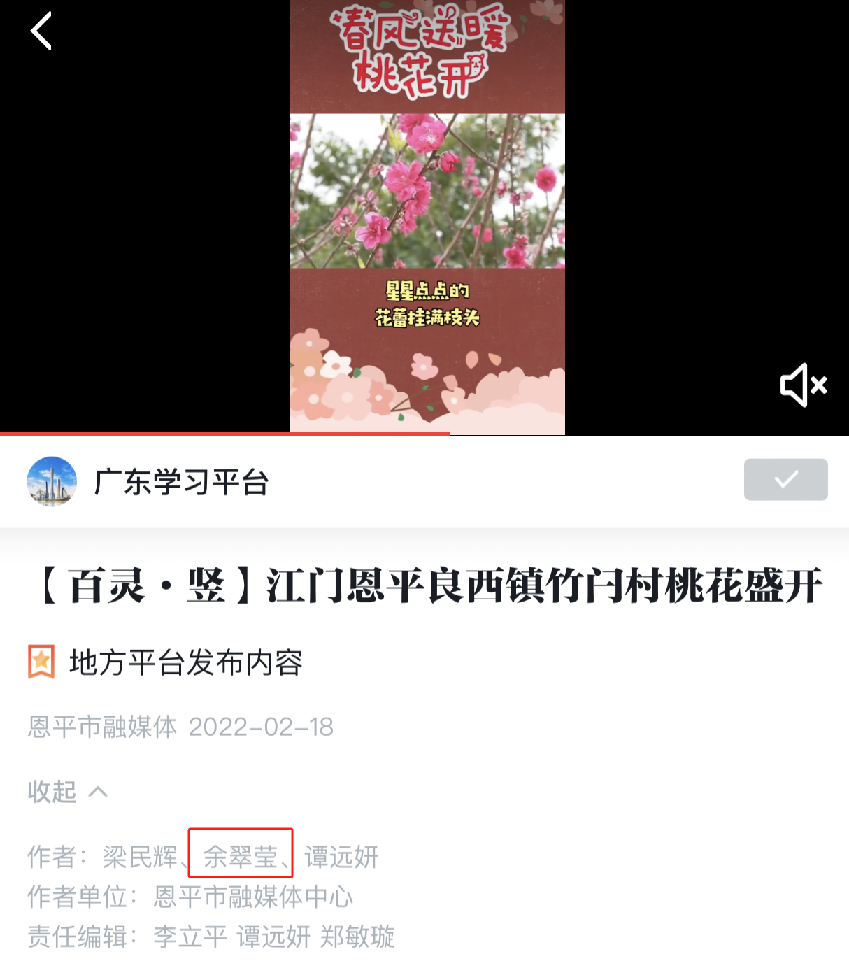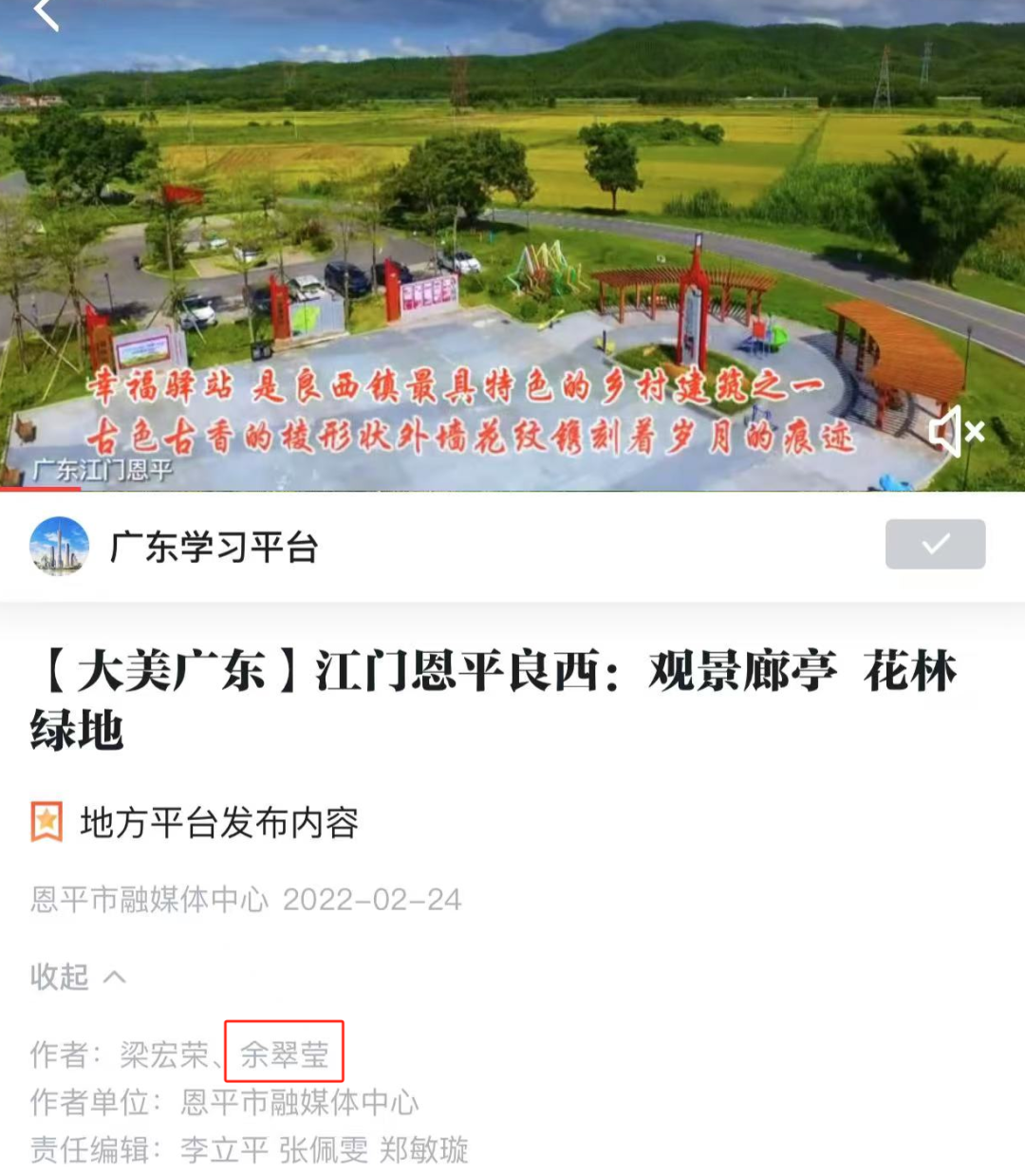 值得欣慰的是,余翠莹始终保持着对新闻事业的热爱与执着追求。策划、组织、编写了多个质量上乘、社会影响力广泛的新闻报道,并屡获殊荣。其参与作品《恩平:长者食堂让老人吃出幸福味》、《恩平非遗月饼,你爱了吗?》分别荣获2022-2023江门市广播影视奖、广播新闻类与广播节目类三等奖,《我们开学啦》荣获恩平市第二届“好声音”全媒体新闻作品比赛最佳新闻摄影奖等荣誉。