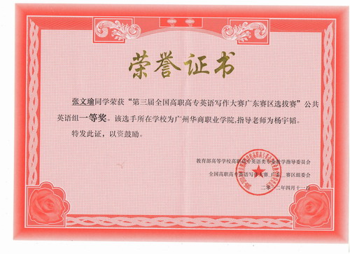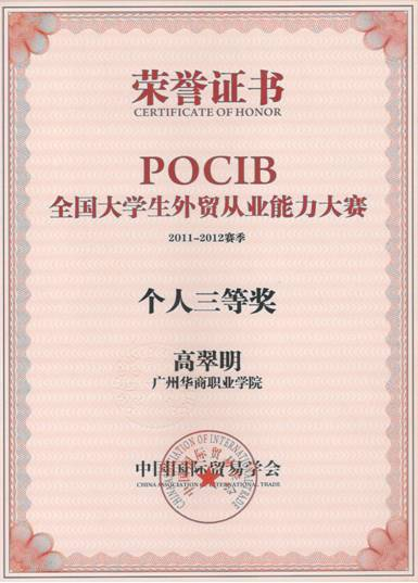 POCIB全国大学生外贸从业能力大赛2011-2012赛季 广州华商职业学院 学生获奖证书 个人二等奖 黄奎烨 个人三等奖 欧璇 古维 吴辉 个人三等奖 钱海媚 高翠明