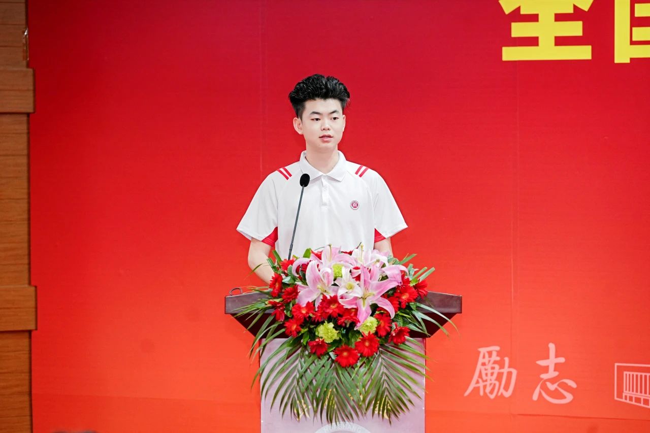 在校生代表廖达鑫发言,他表达了对廖志略师兄的崇高敬意,用“选择、创造、担当”三个关键词分享了廖志略师兄对他的启示,并号召同学们以师兄为榜样,将职业技能化作服务社会的利器,绽放青春光彩。