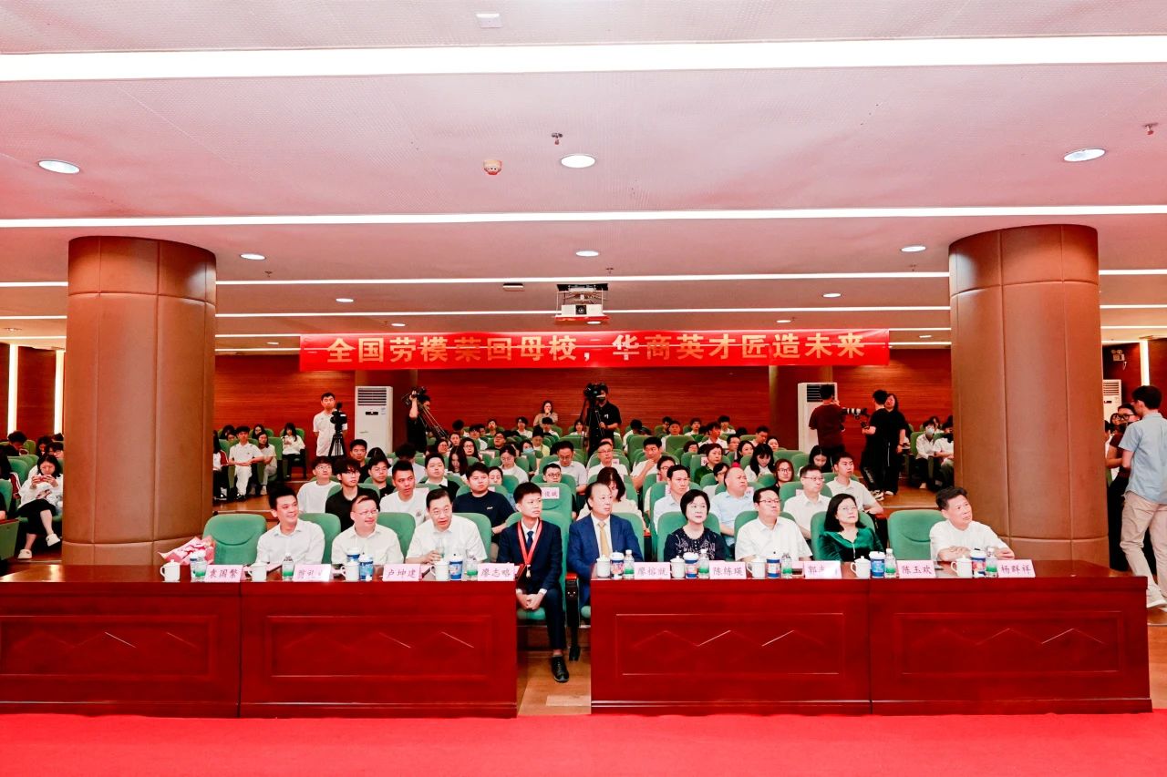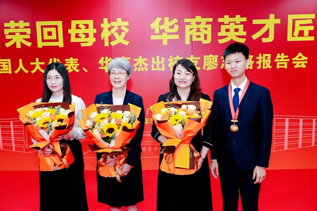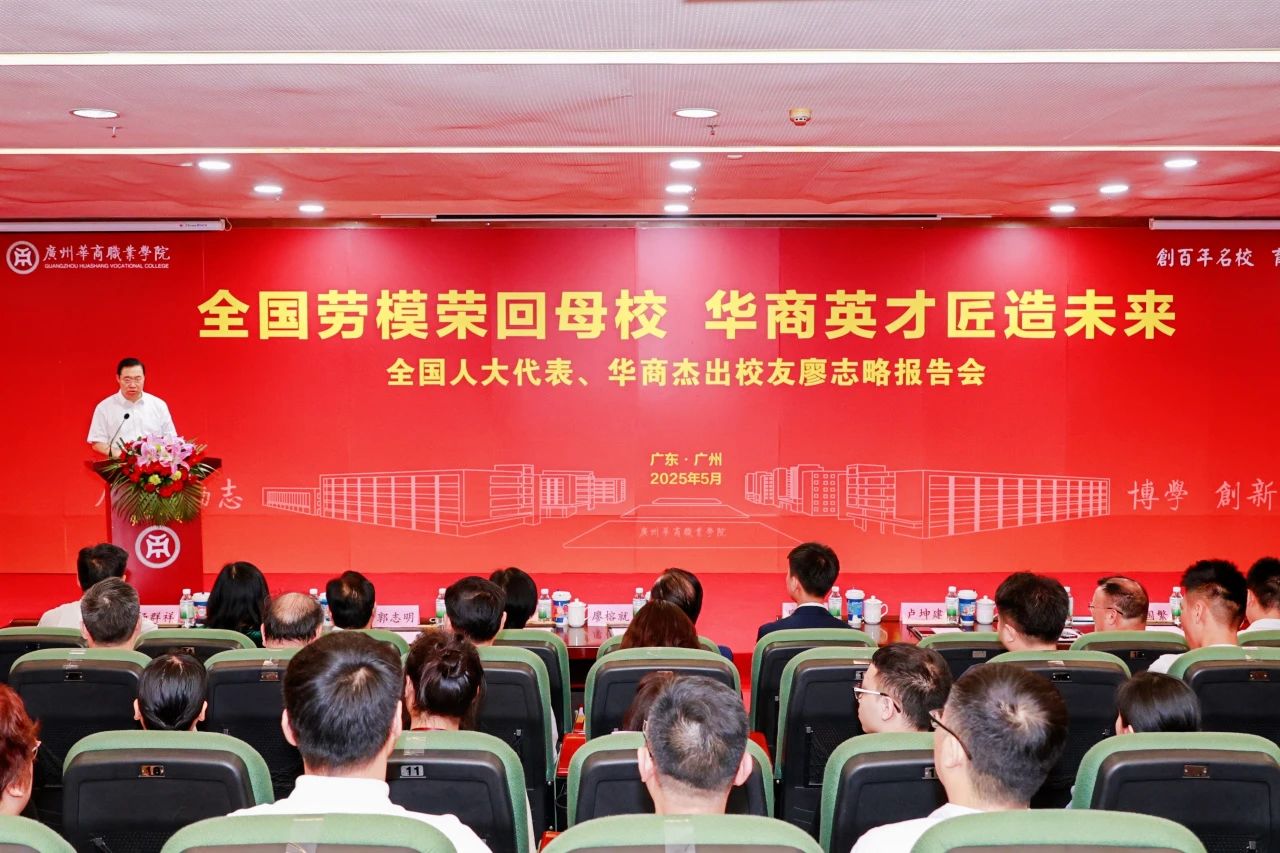 今天,我们怀着无比喜悦和激动的心情,在华商校园,隆重举行全国五一劳动模范、杰出校友廖志略荣返母校报告会,这不仅是一次荣耀的相聚,更是一场华商学予以奋斗书写时代答卷的精神盛宴!在此,我向志略校友致以崇高的敬意和诚挚的祝贺!祝贺你从全国人大代表到“全国劳动模范”的双重加冕!你以职教生的身份登上国家荣誉之巅,向世人证明了:职业教育,是成就人生的星光大道;技能报国,是时代赋予青年的壮丽征程;华商职院,是培育强国人才的沃土和摇篮!
