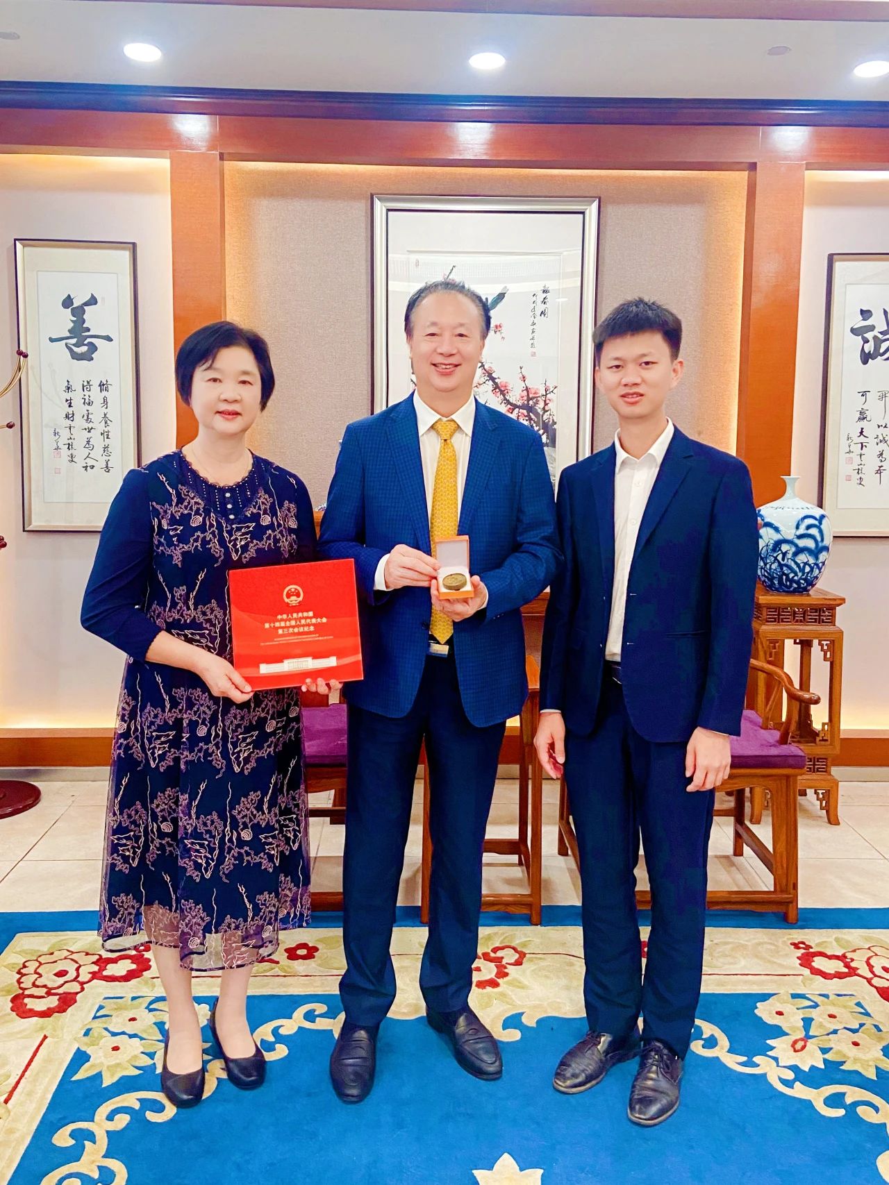 会后,廖志略向董事长廖榕就及夫人陈练瑛赠送中华人民共和国第十四届全国人民代表大会第三次会议纪念品。