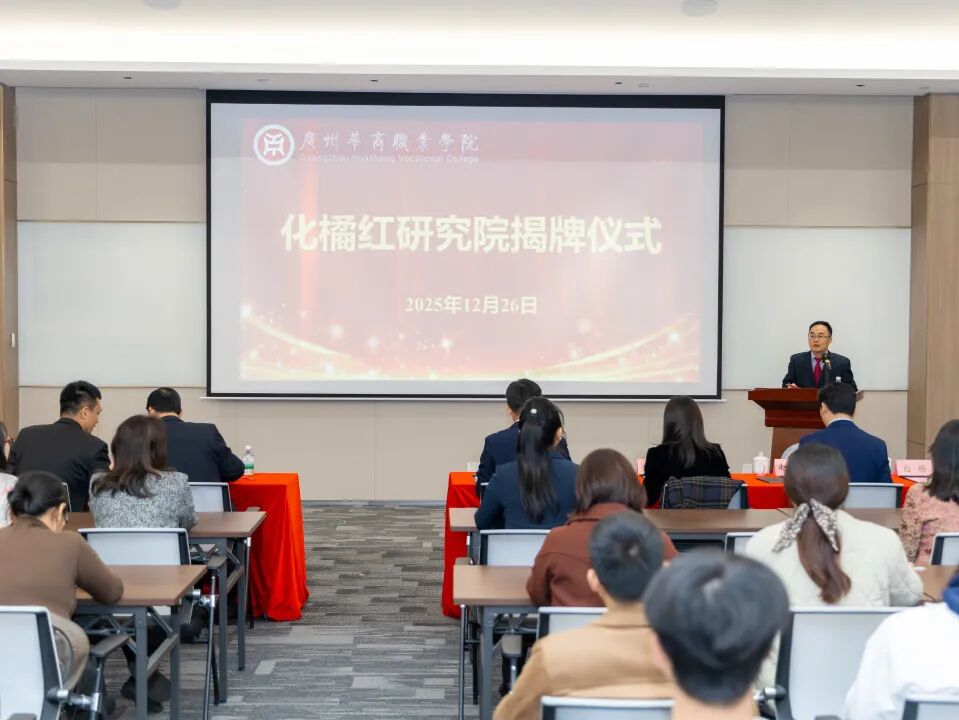 12月26日下午,广州华商职业学院化橘红研究院揭牌仪式在华商会议展览中心A03会议室举行。华商科教集团副总裁刘文琦,广州华商职业学院校长卢坤建,常务副校长袁国繁,副校长孙虎、赵永锋,校长助理、学校办公室主任袁晓斌,全国劳动模范、全国人大代表、化州市培林橘红种植专业合作社社长、华商杰出校友廖志略,化州市培林橘红种植专业合作社销售总监兼社长助理劳金玲、生产部主管兼社长助理谢久耀出席仪式,各二级学院及职能部门相关负责人、教师代表与学生代表齐聚一堂,共同见证这一重要时刻。仪式由产科教融合办公室主任王克明主持。
