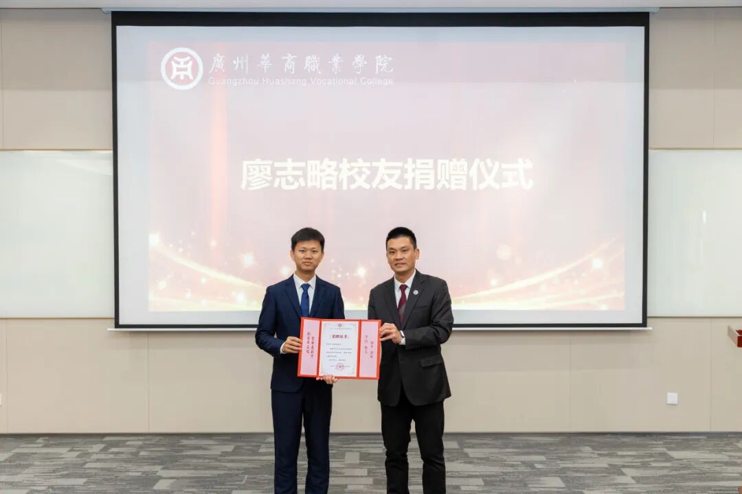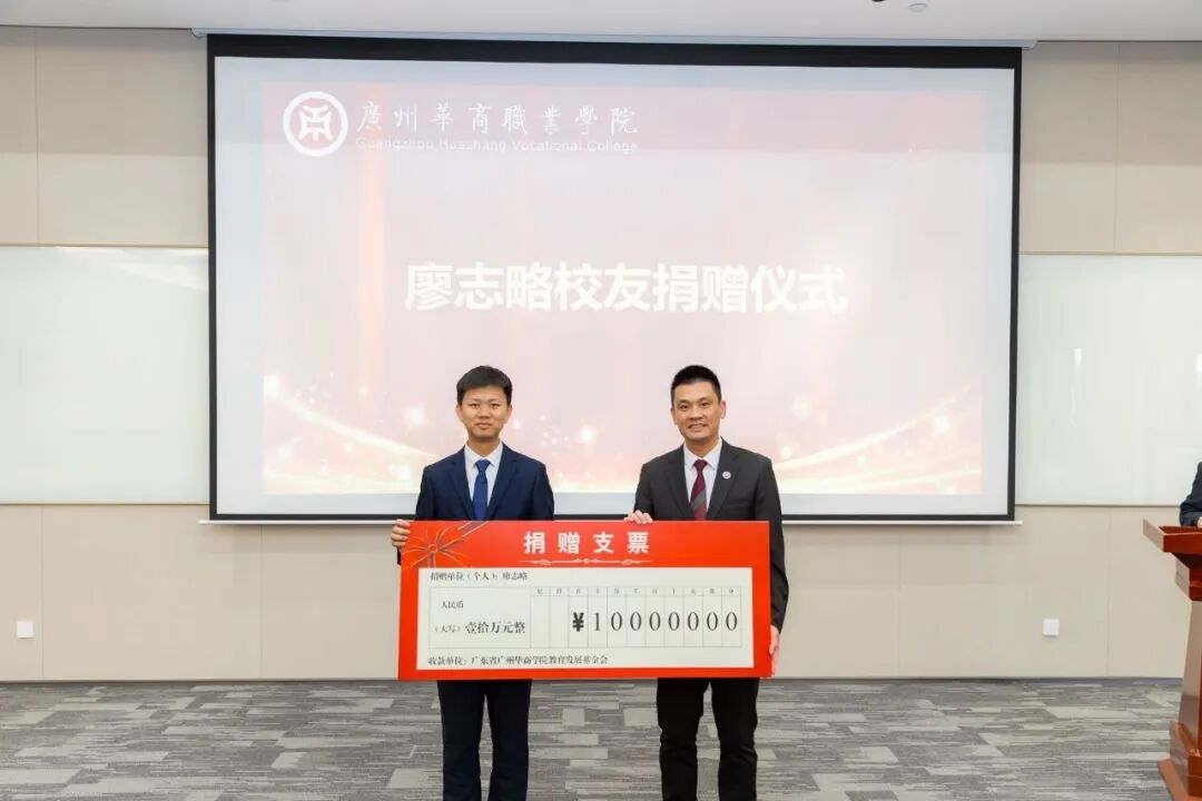 签约环节结束后,现场进入捐赠签约与捐赠仪式环节。华商杰出校友廖志略心系母校发展,与广州华商职业学院和广州华商学院联合发起成立的广州华商学院教育发展基金会达成捐赠协议,向学校捐赠10万元,用于支持学校科研工作、人才培养以及相关设施设备的购置等。常务副校长袁国繁代表学校及基金会,郑重地从廖志略校友手中接过捐赠支票,现场响起热烈的掌声,对廖志略校友的慷慨善举表示衷心的感谢与崇高的敬意。
