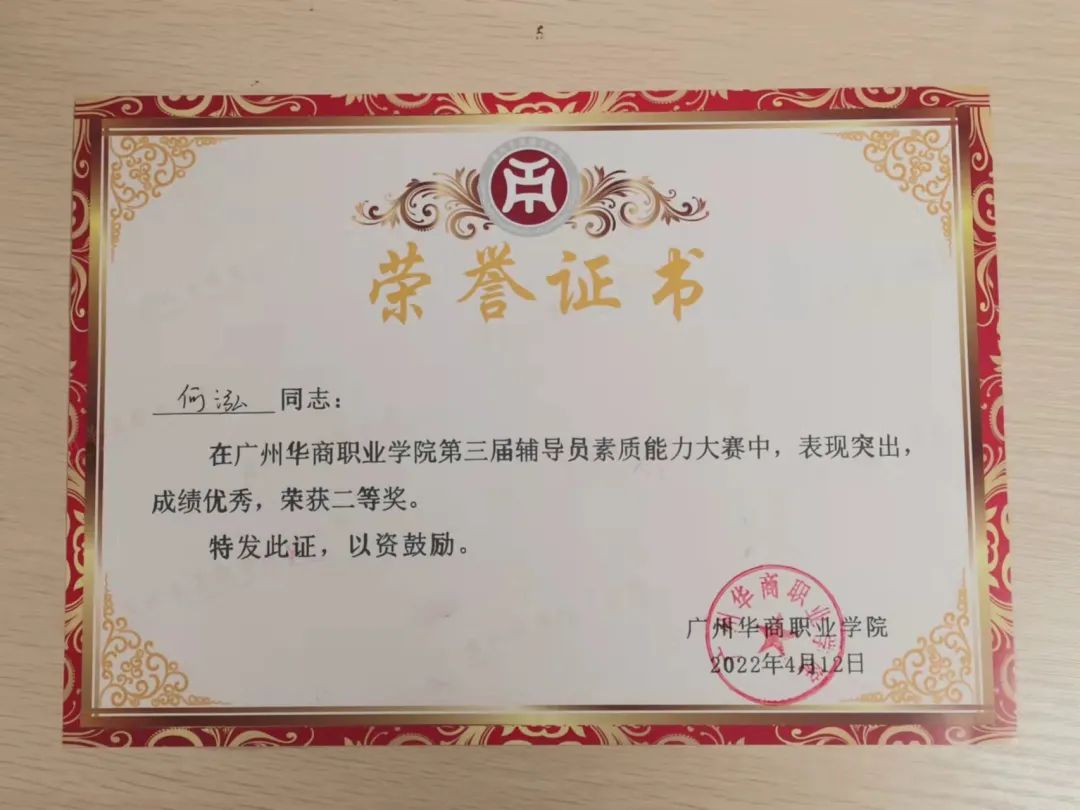 为深入贯彻落实辅导员队伍建设,进一步提高辅导员素质能力和工作水平,广州华商职业学院举行第三届辅导员素质能力大赛。我院辅导员何泓老师于4月11日顺利通过初赛(笔试)环节,成功进入复赛;4月12日参加复赛并脱颖而出,荣获广州华商职业学院第三届辅导员素质能力大赛“二等奖”