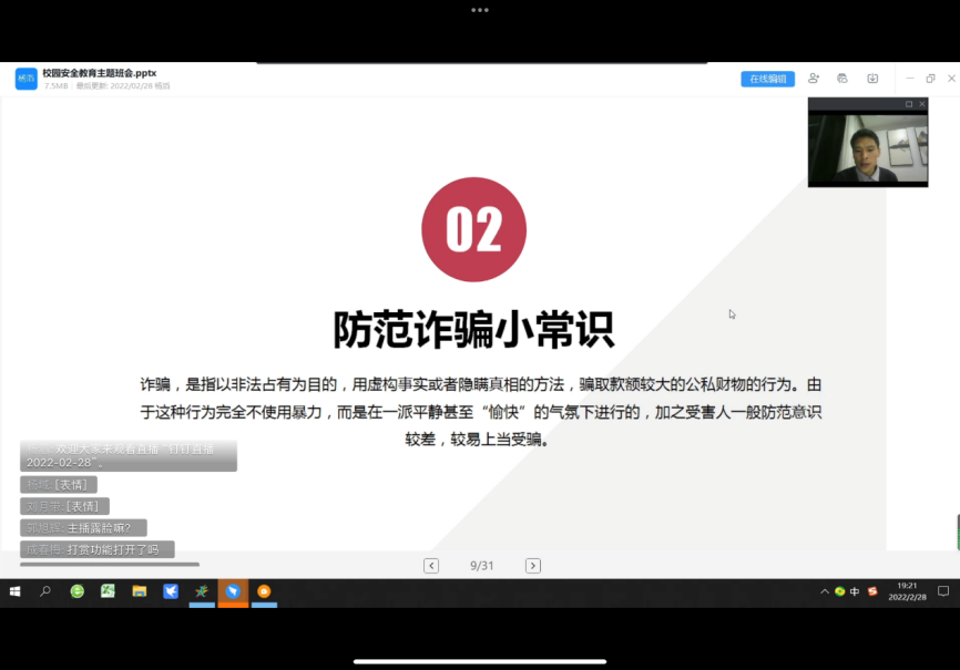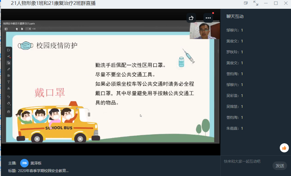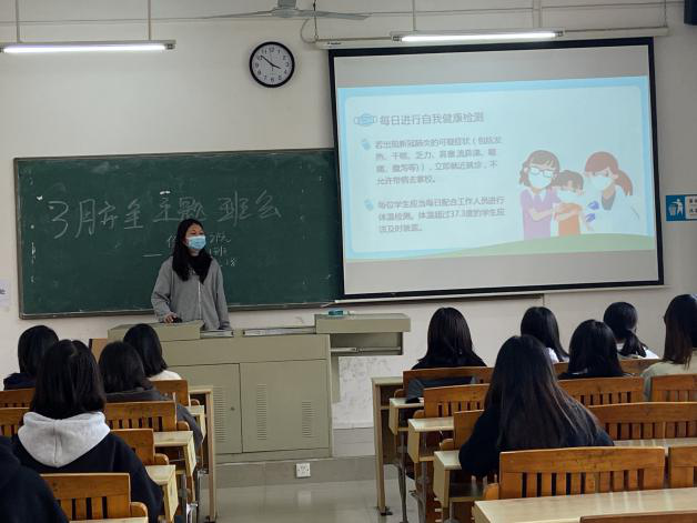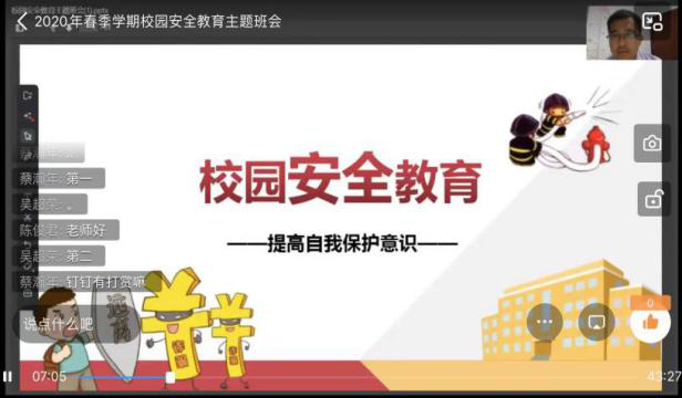 此次班会主要是围绕着“疫情防控、防范诈骗、防火安全、安全用电以及食品安全”五个方面的内容展开。
