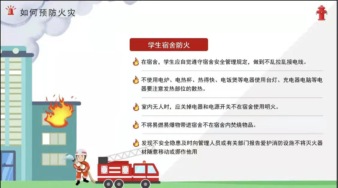 三、学生宿舍用火用电安全,不在宿舍使用明火及大功率电器,不乱拉、乱接电线。了解火灾时处置方法、逃生技巧以及发现触电人员的处理方法,自觉要遵守宿舍安全管理规定。