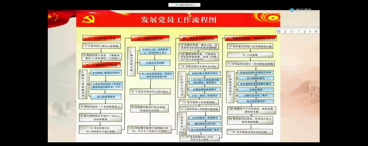 为进一步落实"三会一课"制度,提高党性修养和理论基础,更好地服务人民。2021年12月20日中午12:30,广州华商职业学院第24期入党积极分子培训班(健康医学院中级党课培训班)第三讲在腾讯课堂顺利举办,校党委办公室组织科科长姚柏洲同志以“党员党籍档案解读”为主题给学员讲授第三讲。
