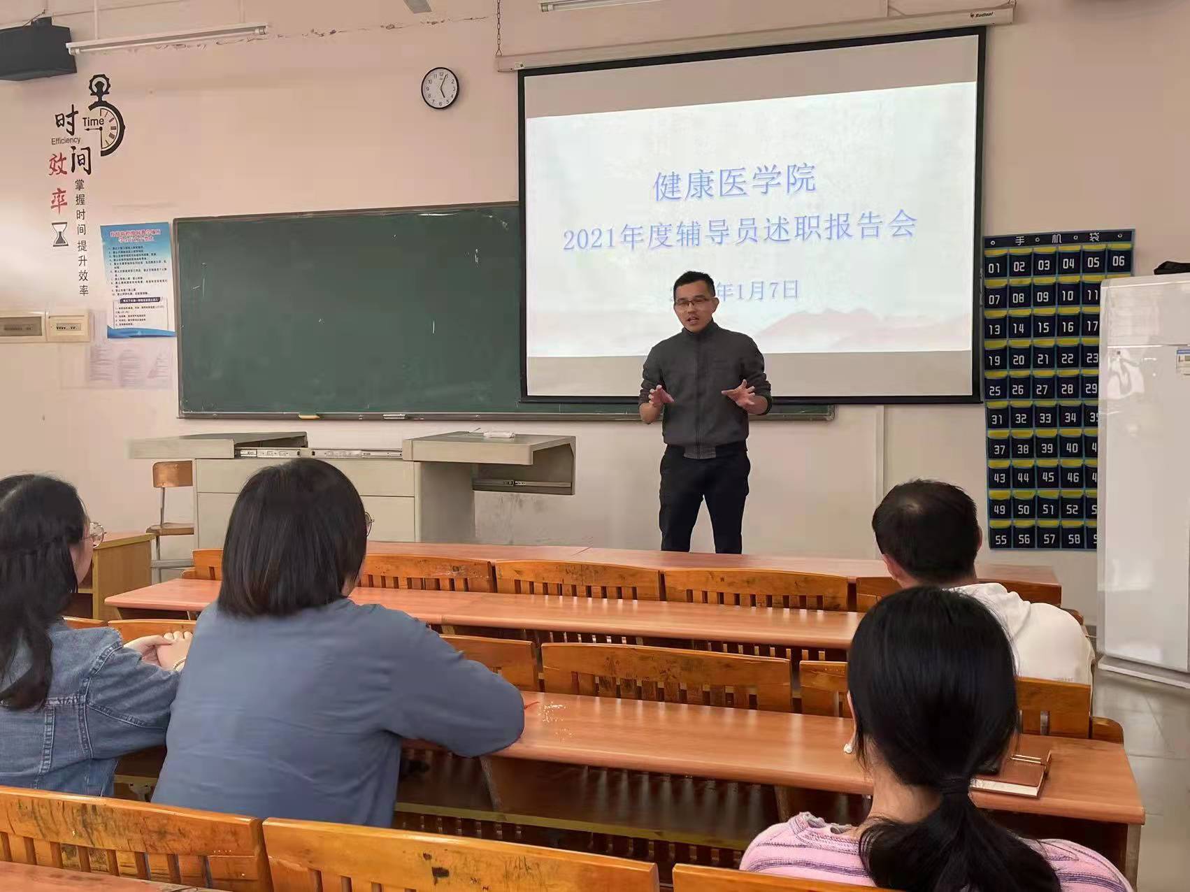 为进一步提高辅导员的思想政治素养和教育管理能力,建设一支“政治强、业务精、纪律严、作风正”的辅导员队伍,2022年1月7日下午,健康医学院在博学楼B506举行2021年度辅导员述职报告会。学院党总支书记、院长温博栋出席报告会,党总支副书记黄泽栋主持。