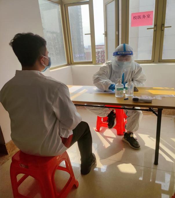 辅导员引导发热学生到医务室临时隔离房进一步诊断。医务室测温点护士接诊到A同学,通过测温仪测得体温38.5℃,立刻为A同学加戴一个外科口罩,调查流行病学史,随后医生初诊为普通发热病患,给学生开具《转诊单》到医院做核酸检测和复诊。