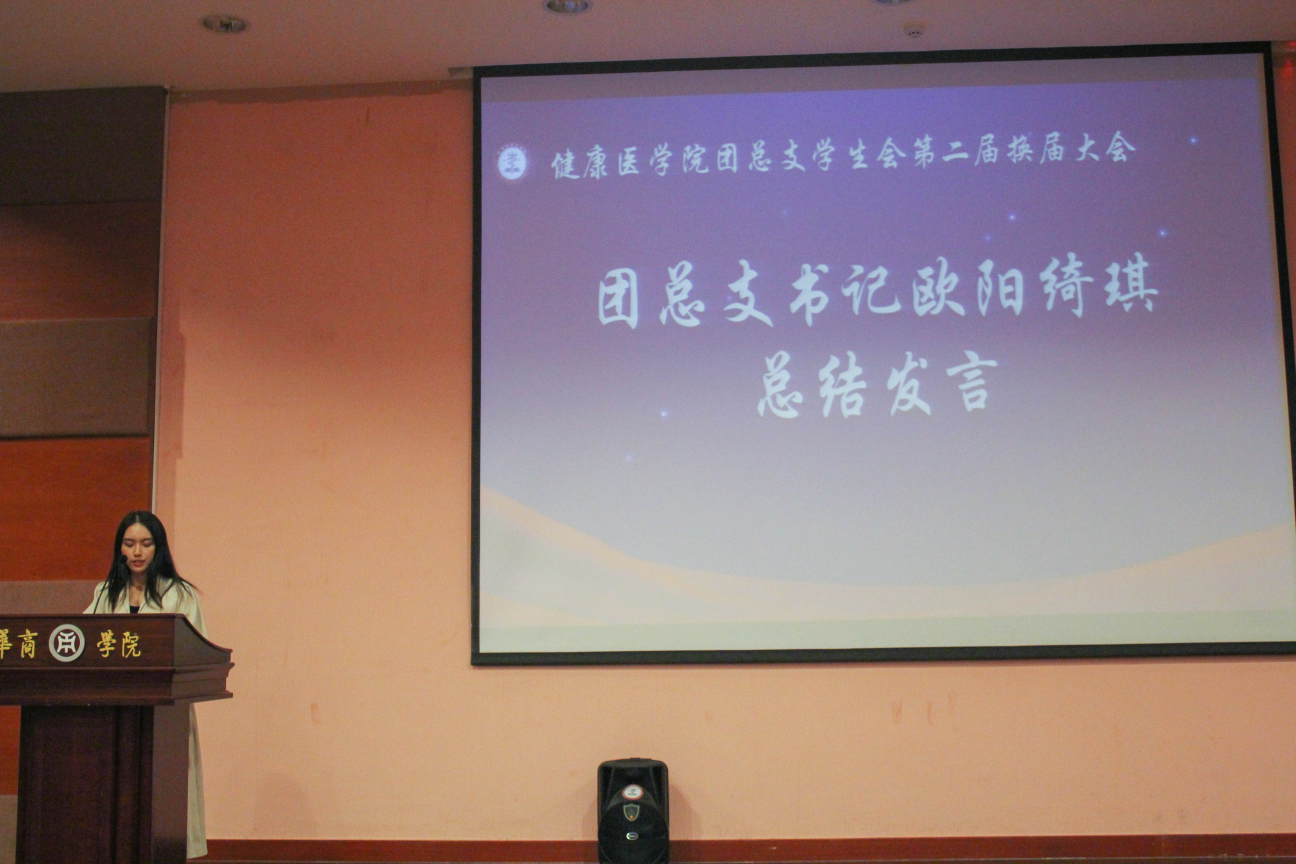 最后,健康医学院团总支学生会指导老师欧阳绮琪老师总结发言,欧阳绮琪老师对近一年来的工作表示肯定与感谢,感谢各位同学为健康医学院的建设与宣传做出的努力,希望各位同学能带着习大大对青年的青春寄语投入到工作中去,将有限的生命投入到无限的为人民服务的事业中,不负时代,不负韶华,不负党和组织的期望!