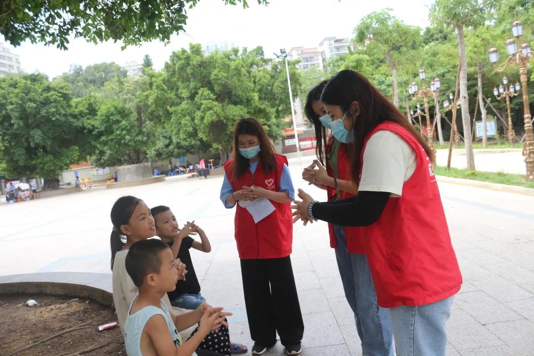 实践队员结合自身专业知识,以实际行动教小朋友简单易懂的洗手法口诀,宣传疫情防控期间的卫生健康知识。
