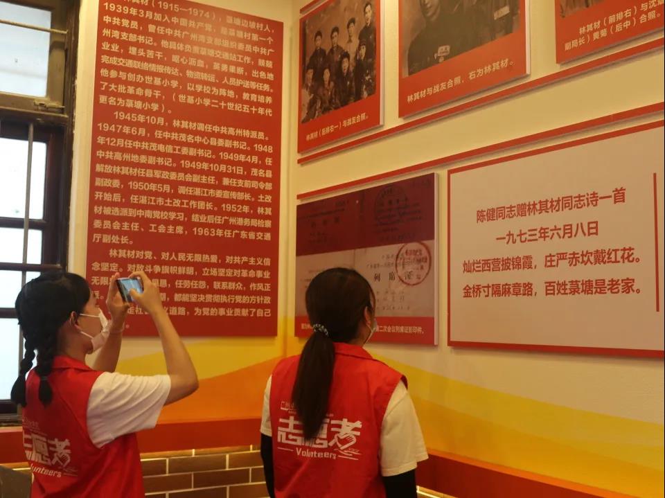 4、林其材事迹展览室:林其材(1915-1974),菉塘坡村人,是菉塘村第一个共产党员,担任中共广州湾支部组织委员,中共广州湾支部书记。负责菉塘交通站工作,兢兢业业,呕心沥血,出色的完成了交通联络情报的传达、物资的运送、人员护送等任务,不管在任何时候都能够贯彻执行党的方针政策,为党的事业奉献自己的毕生精力。