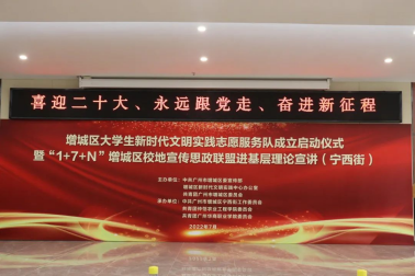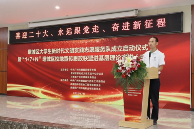 7月11日上午,主题为“喜迎二十大、永远跟党走、奋进新征程”的增城区大学生新时代文明实践志愿服务队成立启动仪式暨“1+7+N”增城区校地宣传思政联盟进基层理论宣讲活动,在增城区宁西街新时代文明实践中心举行,参加启动仪式的人员有增城区区委常委、宣传部部长,宁西街党工委书记廖平,华商职业学院党委书记翁礼成教授,广州华商职业学院大学生新时代文明实践志愿服务队和仲恺农业工程学院大学生新时代文明实践志愿服务队。