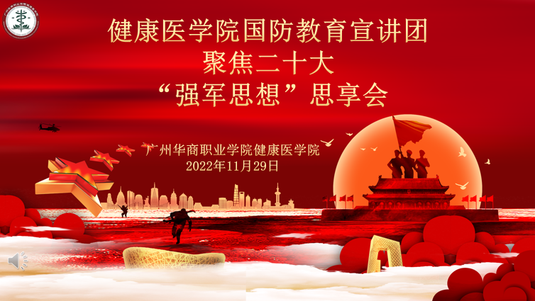 2022年11月29日,健康医学院国防教育宣讲团开展聚焦二十大“强军思想”思享会,宣讲团成员踊跃参与分享学习党的二十大“强军思想”心得体会,并表示自己将保持军人本色,退伍不褪色,传承好部队的优良传统和作风,完成好今后的工作。
