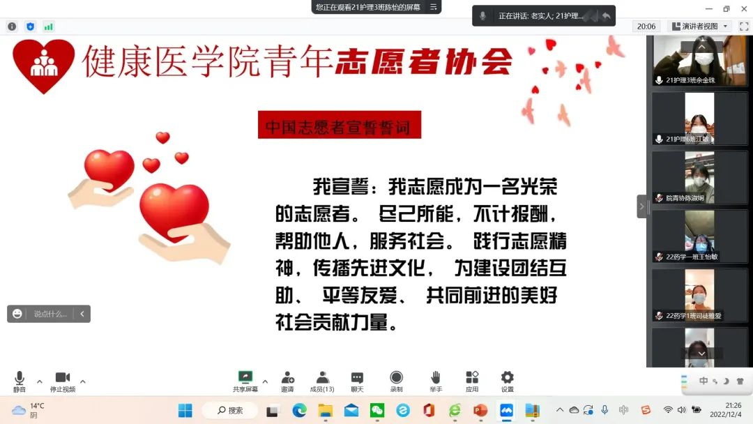 在这个特殊的日子,健康医学院青年志愿者协会组织开展了关于世界志愿者日的线上学习。同学们在会议中学习了志愿者的奉献精神,并在会议中进行宣誓,志愿成为一名光荣的志愿者,帮助他人,服务社会,为社会贡献自己的力量