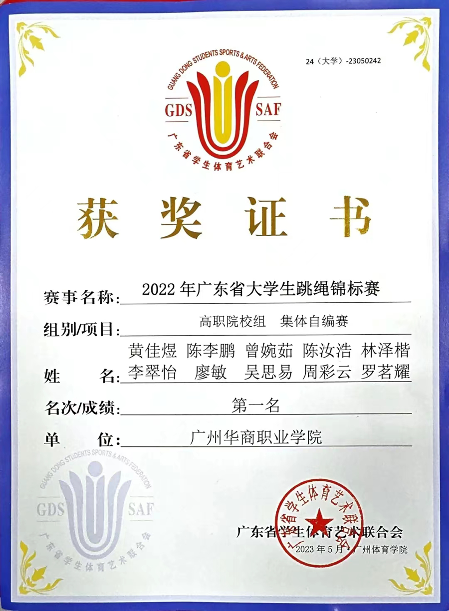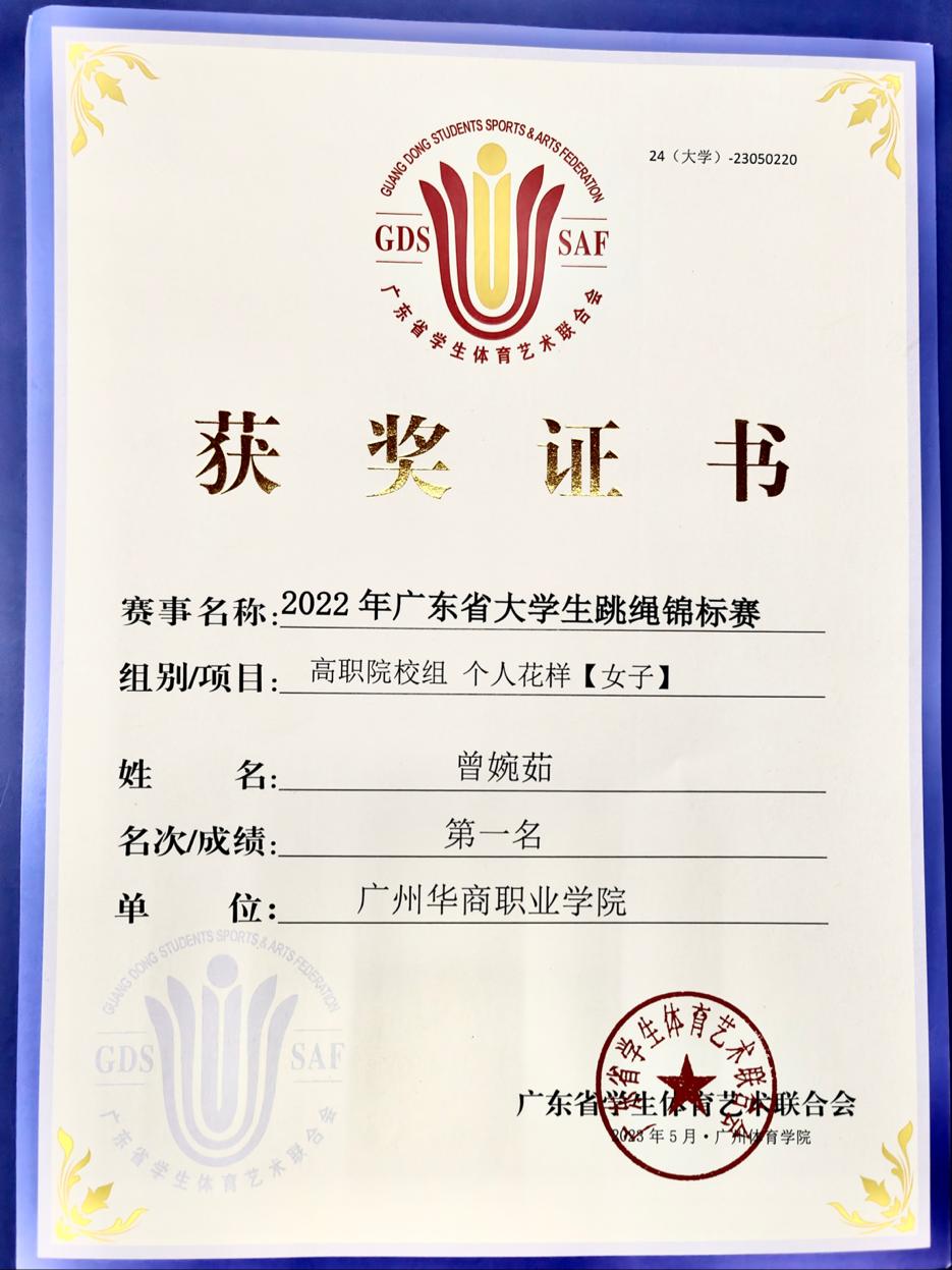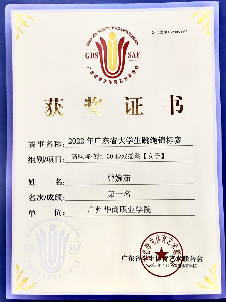 其中,健康医学院22中药学2班曾婉茹同学作为队长与其他队员一同前往广州体育学院参加广东省高校跳绳比赛,参与项目共计12项。在此次比赛,曾婉茹一共参与了三项,并都荣获第一。
