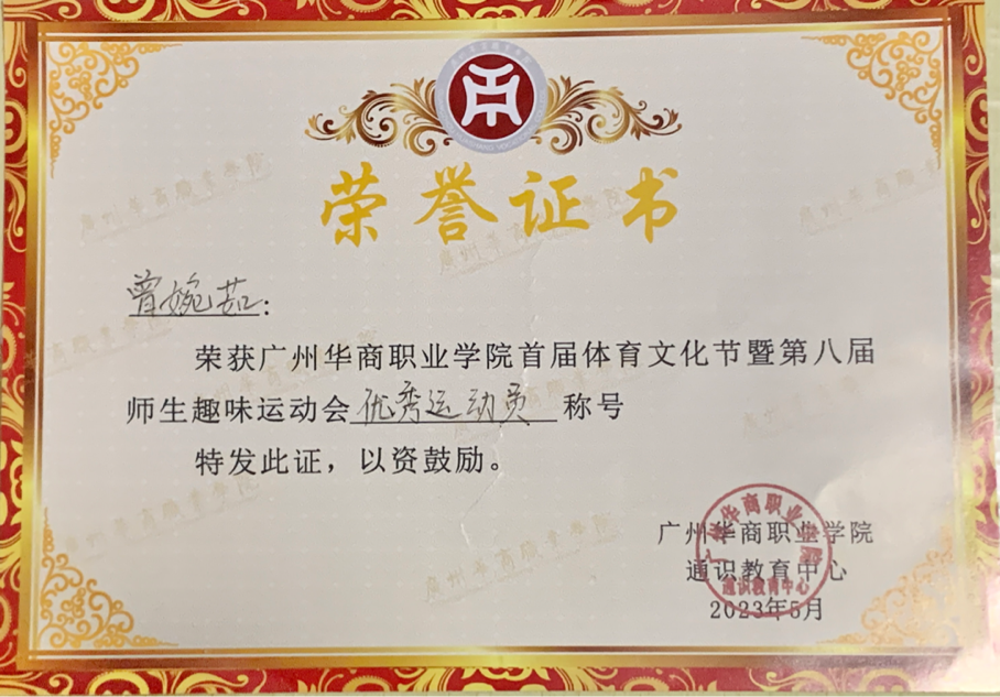 趣味运动会上,曾婉茹发扬顽强拼搏的体育精神,赛出水平,赛出风格,荣获优秀运动员奖项.