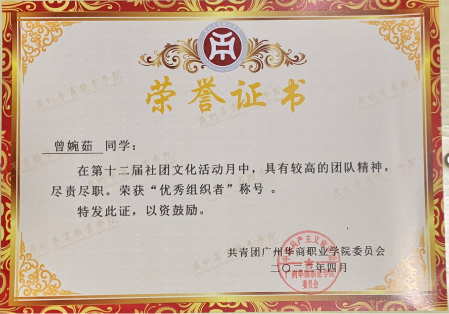 在这学期的社团活动中,曾婉茹积极参与社团活动,带领着队员积极克服困难顺利完成任务,取得了优秀组织者的奖项。