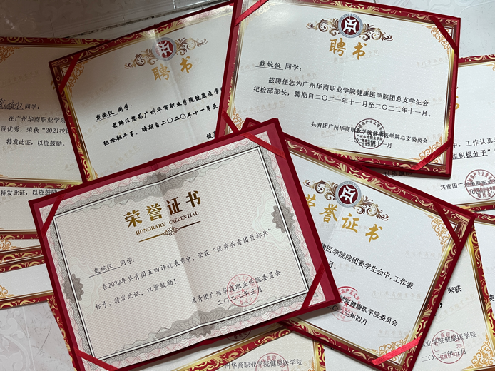 2.2021-2022学年获“校奖学金一等奖”、“优秀共青团员标兵”、华职第十届雷锋月活动“先进个人”称号、华职“校园防疫”活动征集海报类二等奖、华职荧光夜跑活动“工作积极分子”称号