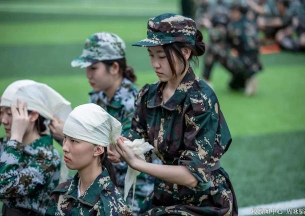 本环节分为两项:掩护伤员与包扎伤员。在战场上,掩护伤员是为了保护他们的生命安全,减少进一步伤害的风险;而包扎伤员则是为了及时救援和治疗,保障他们的生命和健康。通过战场救护演练,健康医学院医学生们深刻意识到生命诚可贵,也更加懂得敬畏生命,矢志守护和保障他人生命安全。