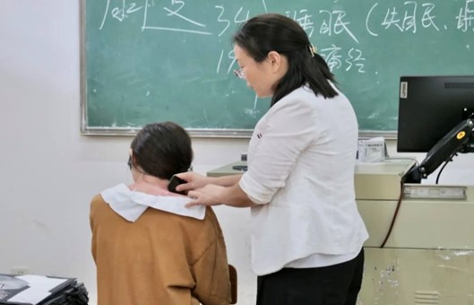 老师从颈部基础知识及重要性、颈部结构、颈椎病西医临床分型、颈痛刮痧重要穴位及压痛点分布、颈痛局部刮痧、颈痛刮痧要领及注意事项、颈痛综合疗法等方面深入浅出的讲授理论知识,手把手指导实践技巧,让同学们对肩颈部刮痧专业知识有了初步的了解。