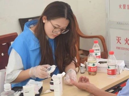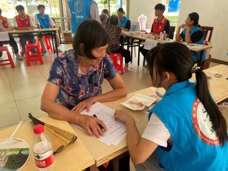 队员马思媛和程俊杰为长者测量血糖,汤淑仙和叶大城为长者测量血压。在测血糖、测血压的过程中,队员们向长者讲述定期测量血压、血糖的重要性。