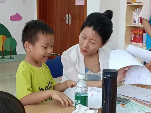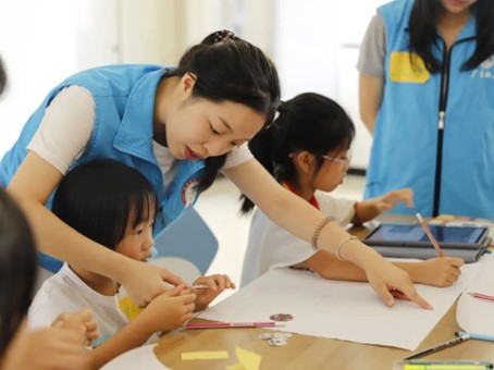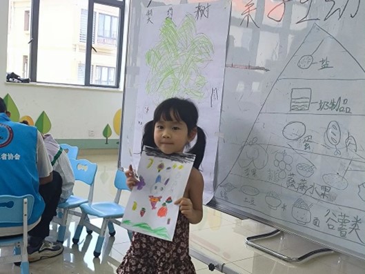 健康医学院专业教师林淡芸老师向小朋友们讲解了膳食宝塔知识,与小朋友们一起绘制儿童膳食宝塔,志愿者们引导小朋友分享各自绘制的图画里都有哪些是自己喜爱的食物。
