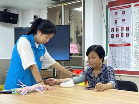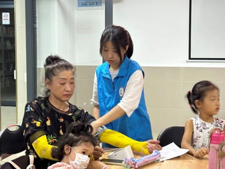 活动开始前,队员王汝欣为长者测量血压,队员们还给长者普及了血压计的使用和正确测量血压的位置,以及告诉长者正常血压应该保持在收缩压90~139mmHg,舒张压60~90mmHg范围内。