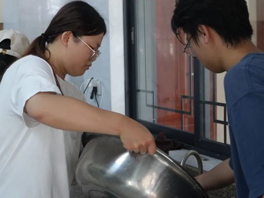 为了更好的筹备即将到来的闭幕仪式,让参加闭幕式的嘉宾和观众能品尝到美味的红薯糖水,队员们同心协力,清洗红薯表皮的泥块,给红薯削皮、砌块,再度清洗后装盆,一盆盆红薯,装载着队员们对老人和小孩的温情关怀和温馨祝福。