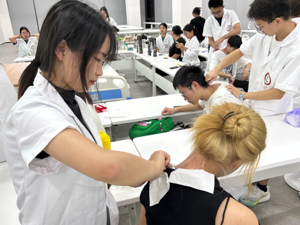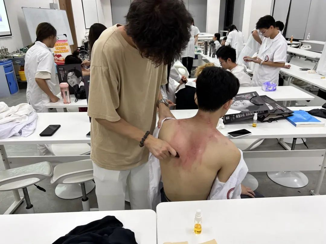 参加活动的队员们分组实操、体验刮痧疗法实际效果,冯老师现场指导修正大家的刮痧手法,细心指导队员们实操学习。