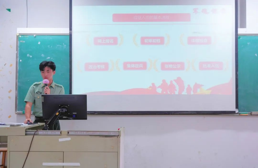 国防教育宣讲员陈仲祺同学详细介绍了征兵入伍的报名流程,包括网上报名、初审初检、体格检查、政治审查、集体定兵、张榜公示和批准入伍。他还列举了大学生入伍所享受的优待政策,如保留学籍、优先评优、放宽转专业限制、退役后工作经历计算工龄等。