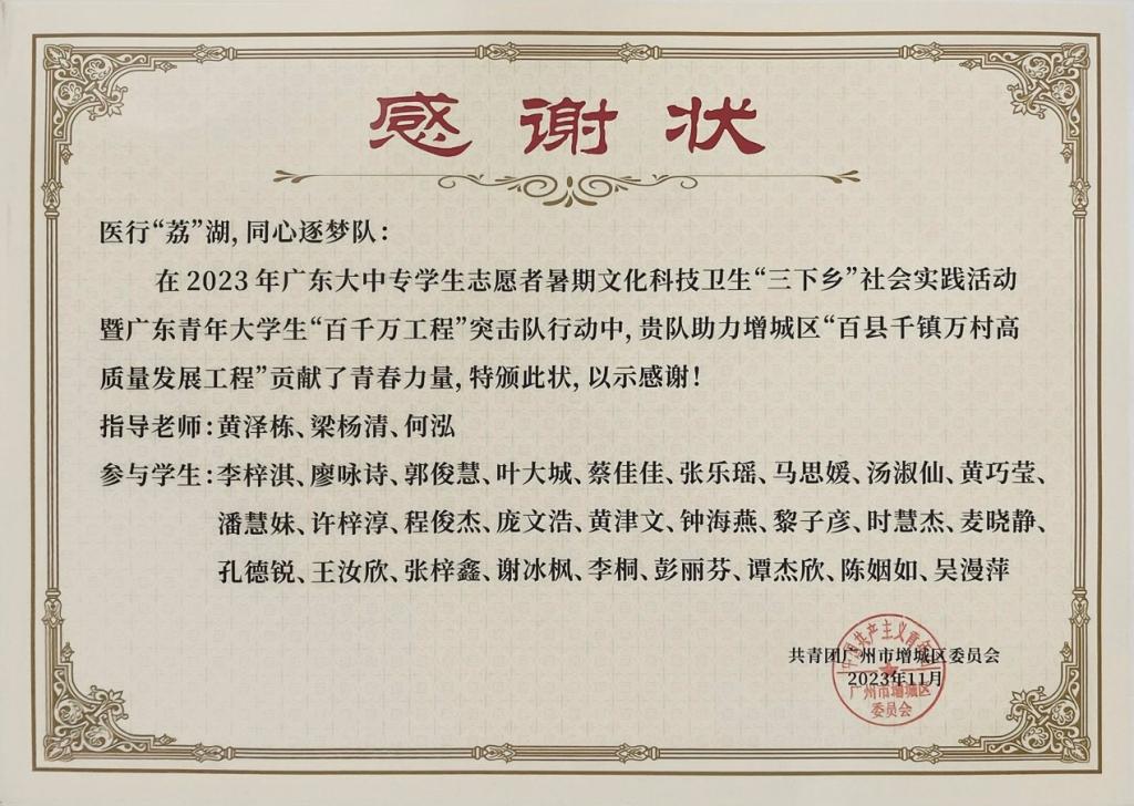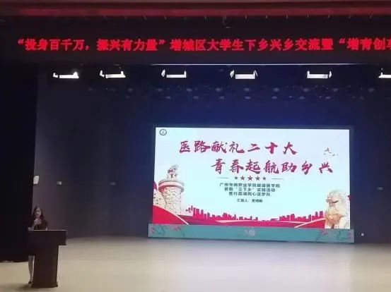 为深入学习贯彻落实党的二十大精神,按照《广东青年下乡返乡兴乡助力“百县千镇万村高质量发展工程”三年行动方案》的工作要求,持续引领青年投身百千万,引导广大青年投身基层一线,结合有关工作安排,共青团广州市增城区委员会联合区“百县千镇万村高质量发展工程”指挥部办公室开展“投身百千万,振兴有力量”增城区大学生下乡兴乡交流暨“增青创享营”启动仪式。梁杨清老师及健康医学院“医行荔湖,同心逐梦队”社会实践队参加了本次交流会。