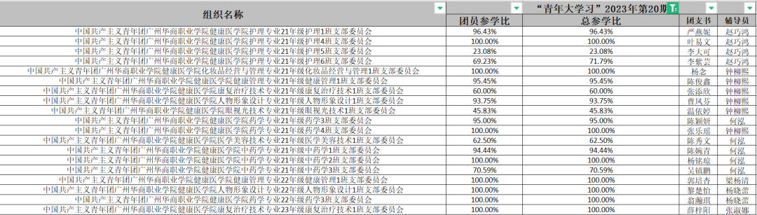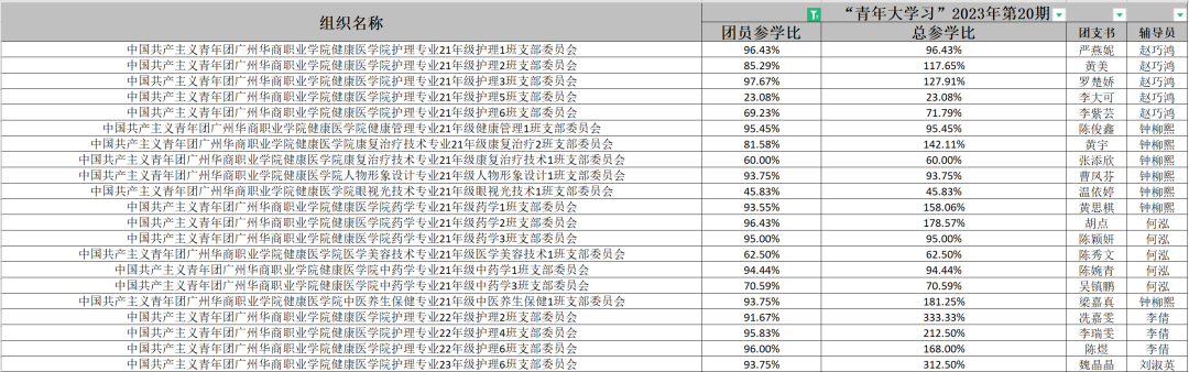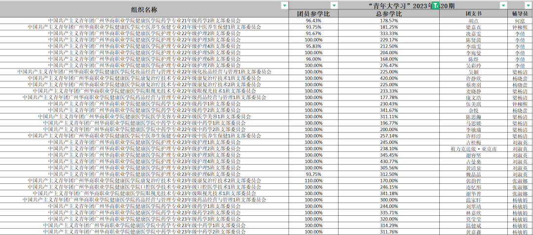 以上班级在2023年第20期的“青年大学习”中班级总参学率超过了160%,真棒,为你们点赞!请继续保持!