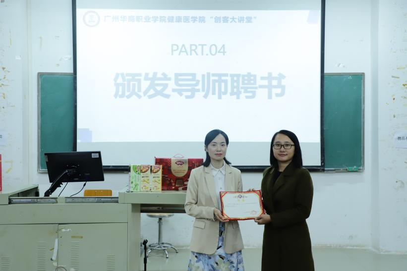 讲座最后,健康医学院院长助理叶雪兰老师为张敏总经理颁发了聘书,聘任其为广州华商职业学院健康医学院创新创业导师,为我院的创新创业导师团队增添多一份力量。