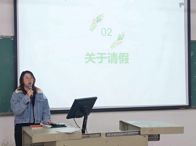 首先,何泓老师向同学们做了详细的自我介绍,肯定了同学们过去的适应能力和学习状态,并围绕校园安全教育、新学期学业规划、心理调适、请销假流程等内容展开,对新学期作出展望。