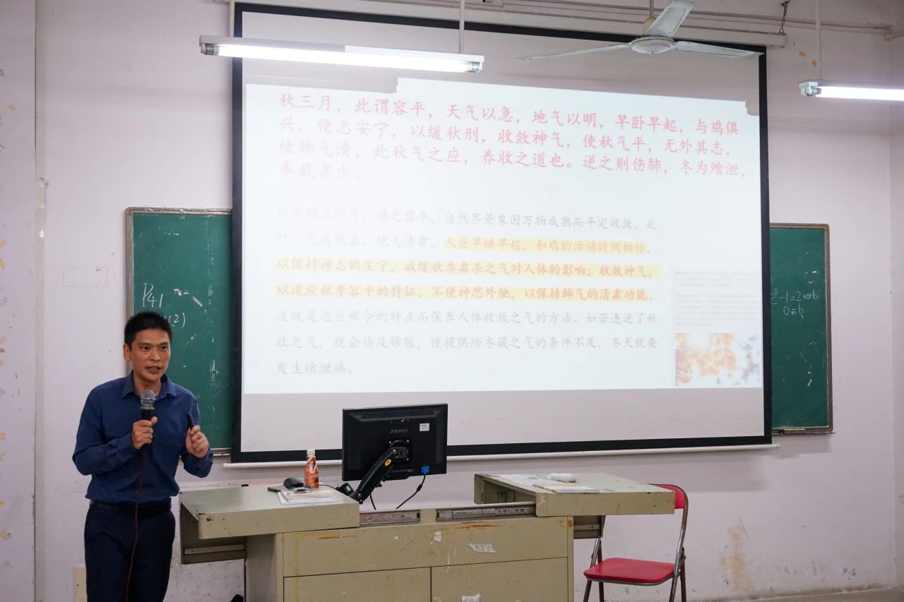 紧接着杨滔老师还特别介绍了秋三月对身体的影响, 从中医养生的角度出发提供了科学实用的养生建议。他强调,顺应时令变化,调整饮食习惯和生活作息,是保持身体健康的关键。这些建议让同学们对如何健康渡秋有了更清晰的认识。